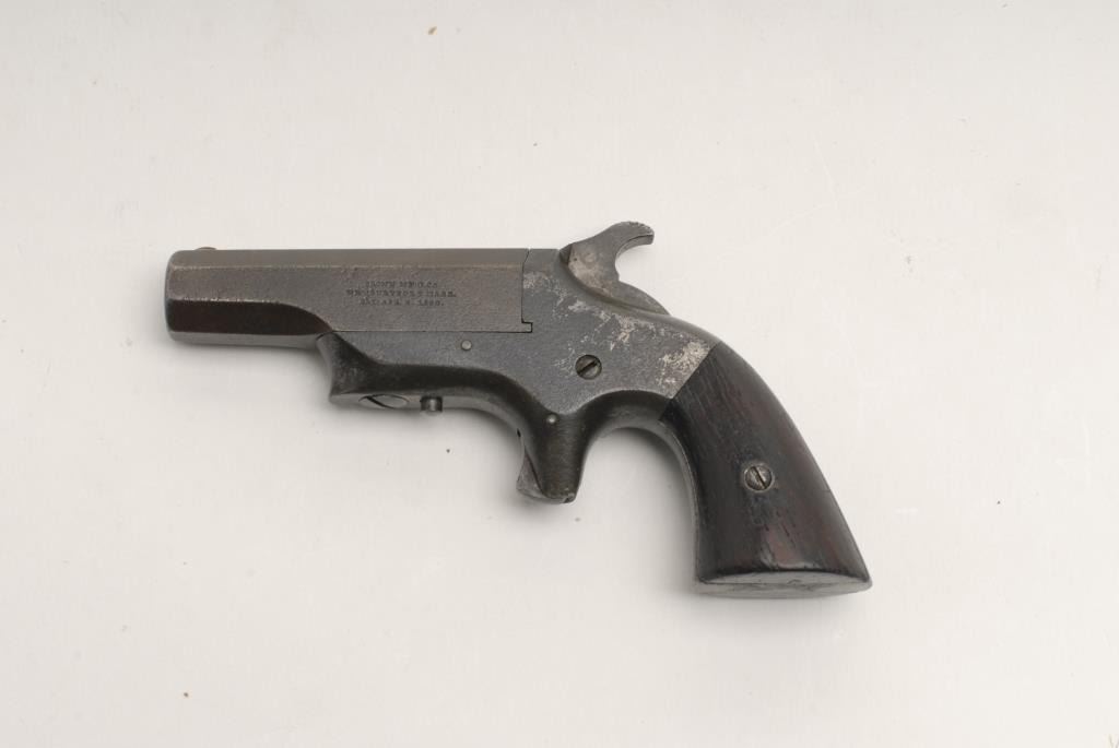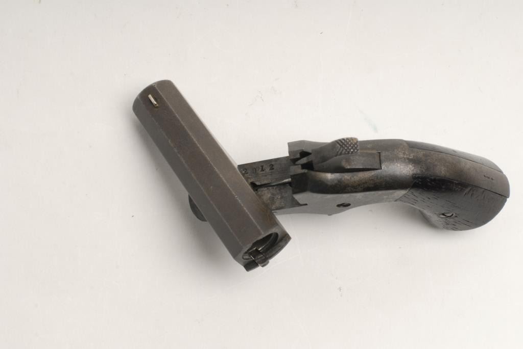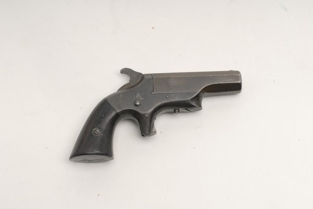 Southerner iron frame single shot derringer, .41 caliber, 2.5” octagon barrel, S/N 2912*, in overall good to very good condition displaying a dark patina to metal surfaces, good bore, crisp action, good markings and wood grips.(Antique). Est.: $300-$600.