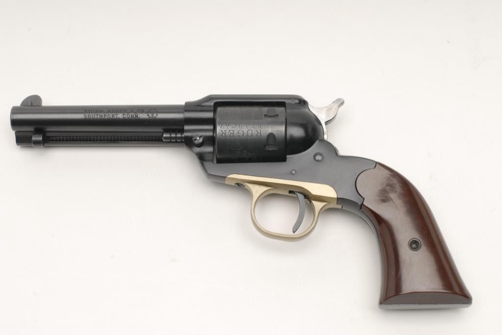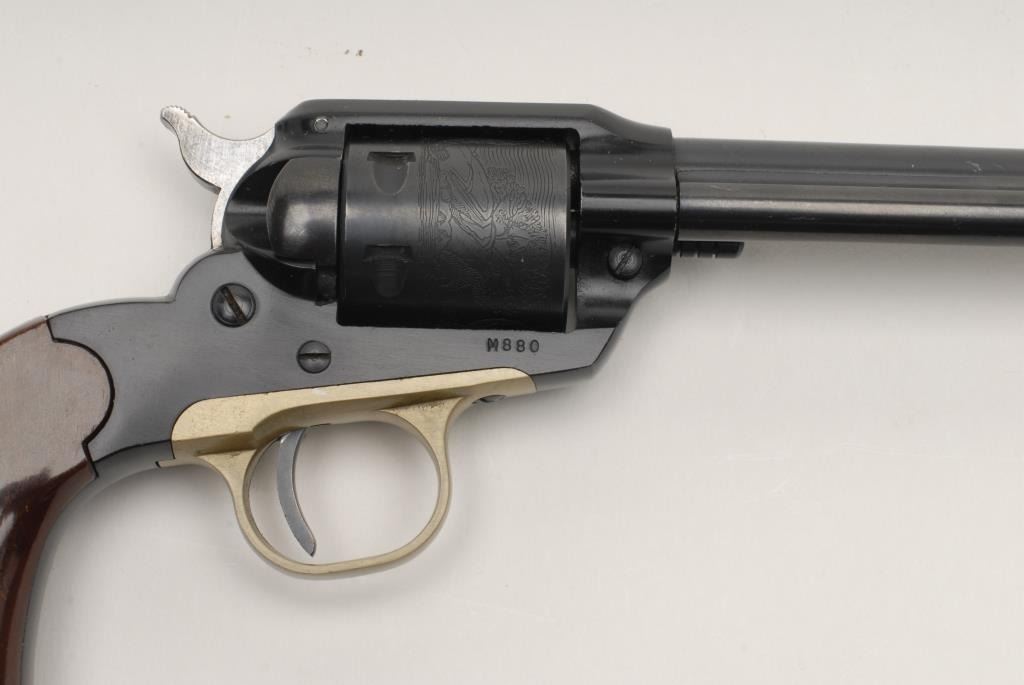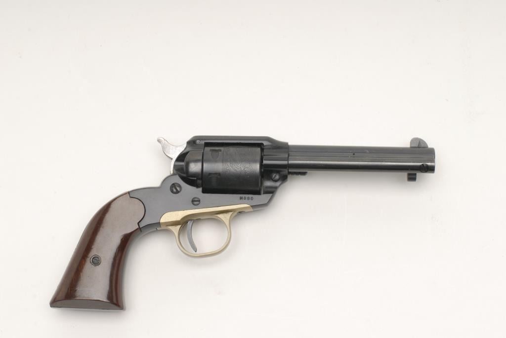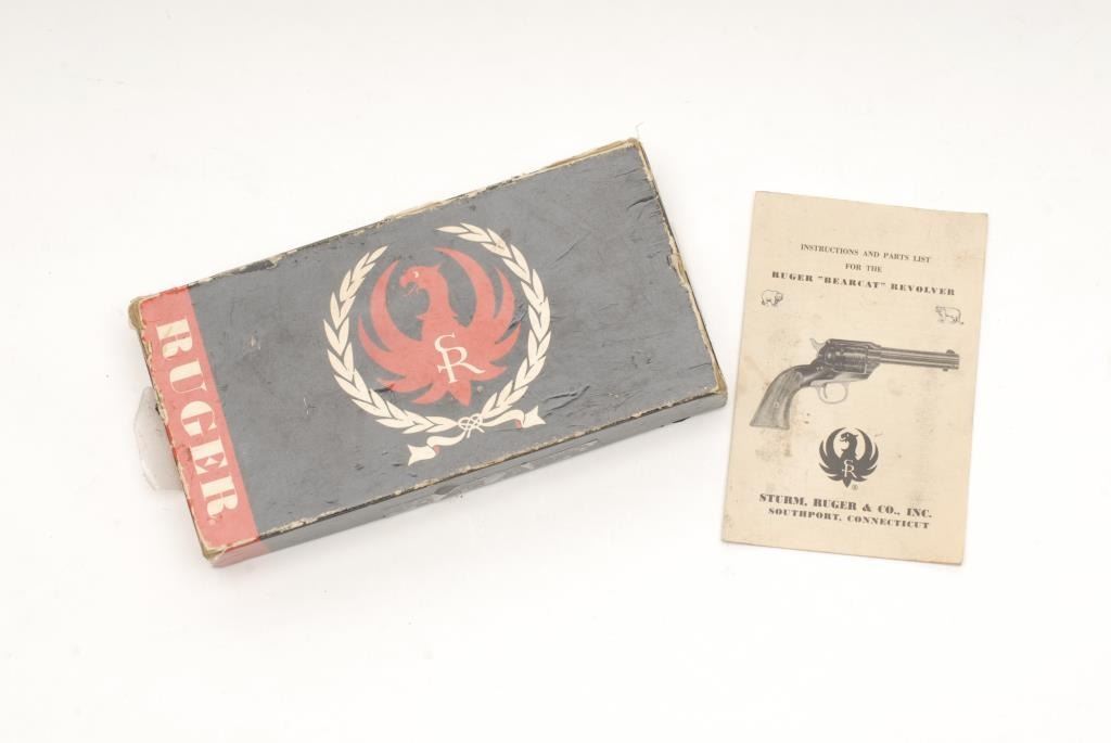 Ruger Bearcat model SAA revolver, .22 caliber, 4” barrel, S/N M880, in like new condition showing little if any use; accompanied by a factory cardboard box with instructions and paperwork; box is fair only; showing taping, tatters and damage. (C&R). Est.: $250-$500.