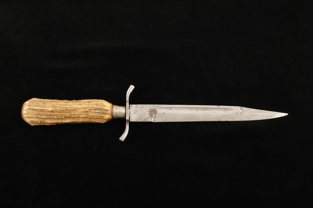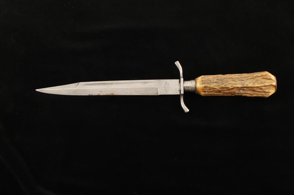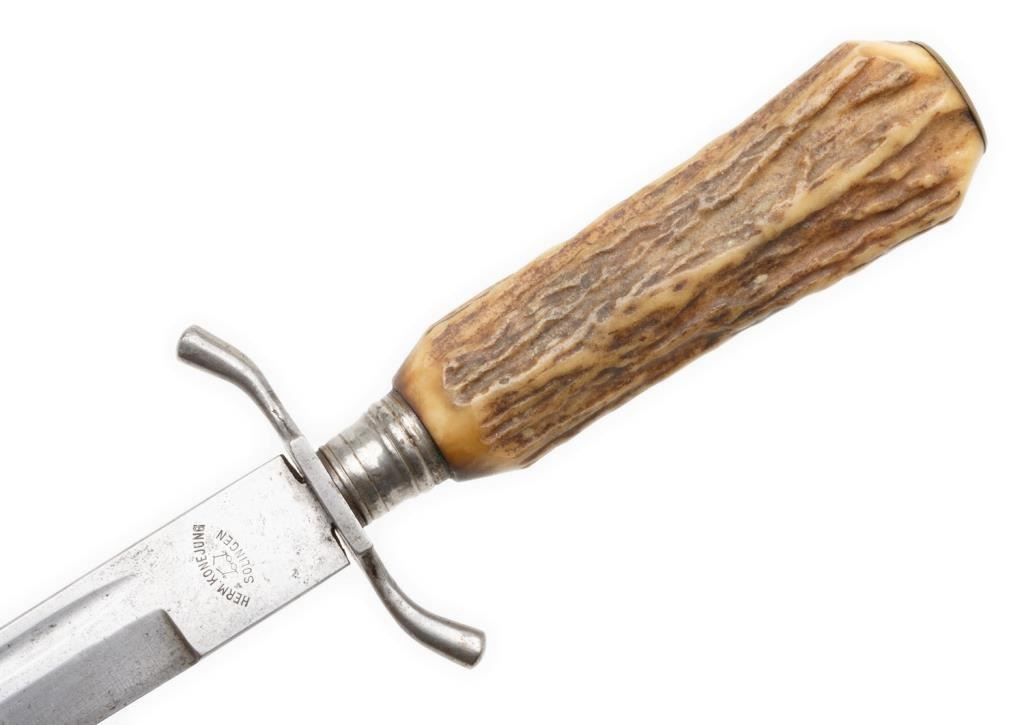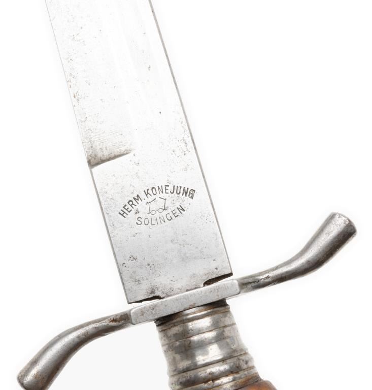 Late 19th Century German hunting knife, approximately 13.5” overall with an 8.5” blade marked “HERM. KONEJUNG/SOLINGEN”; overall good condition with stag grip and some scattered spots of erosion on blade. Est.: $150-$300.