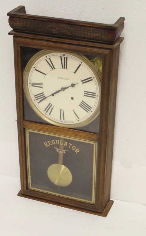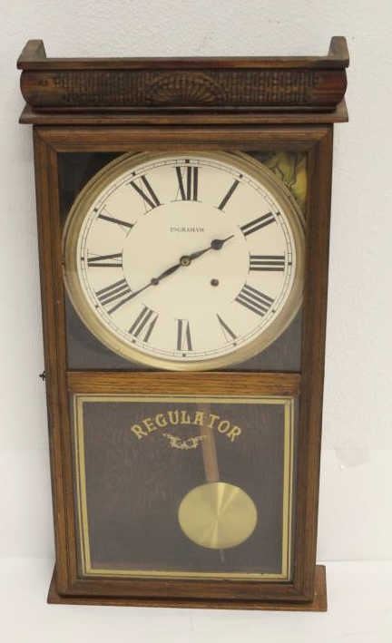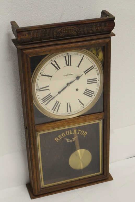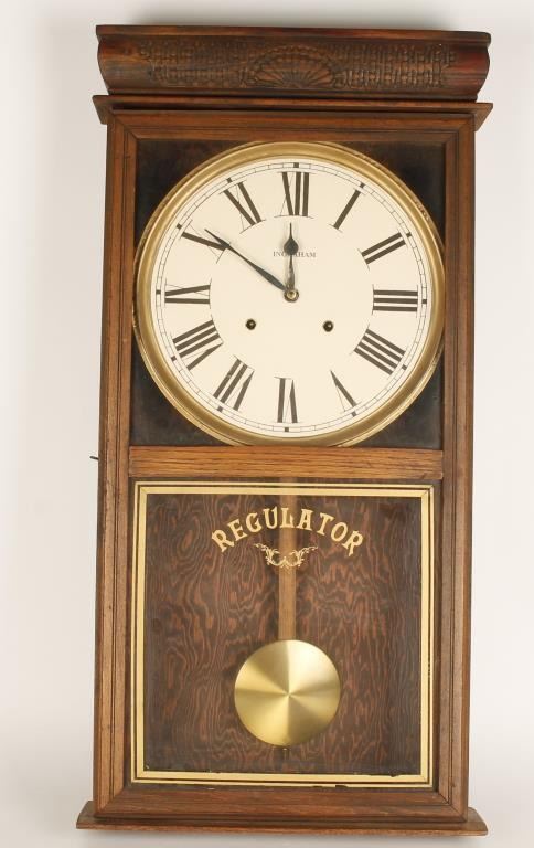 Lot 966 Ingraham Regulator Wall Clock, carved upper Gallery complete, working condition unknown. Est:$100-