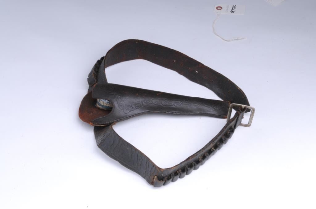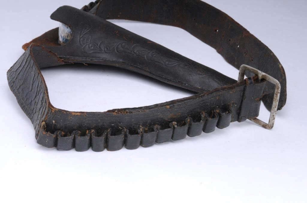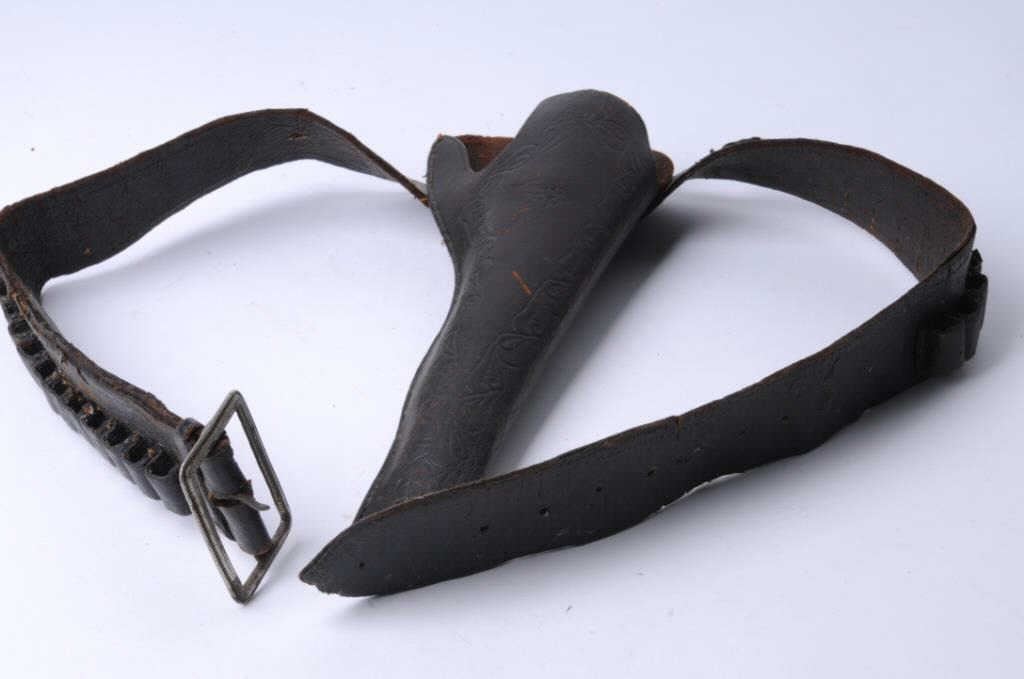 Well matching Slim Jim holster and cartridge belt for a Colt S.A. with large caliber loops for .44 or .45. Border tooled black leather holster showing no name. good overall with some small losses and normal aging mostly to the belt circa1870s-80s. Est.: $350-$700