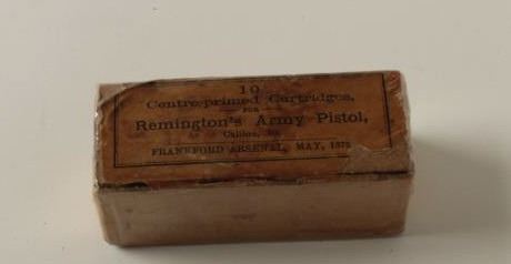 Lot 1002 Original box of 10 Centre-primed cartridges for Remington’s Army pistol, .50 caliber, Frankford Ar