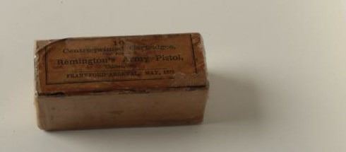 Original box of 10 Centre-primed cartridges for Remington’s Army pistol, .50 caliber, Frankford Arsenal, May 1873 dated; shrink wrapped and in overall good to very good condition. Est.: $200-$400.