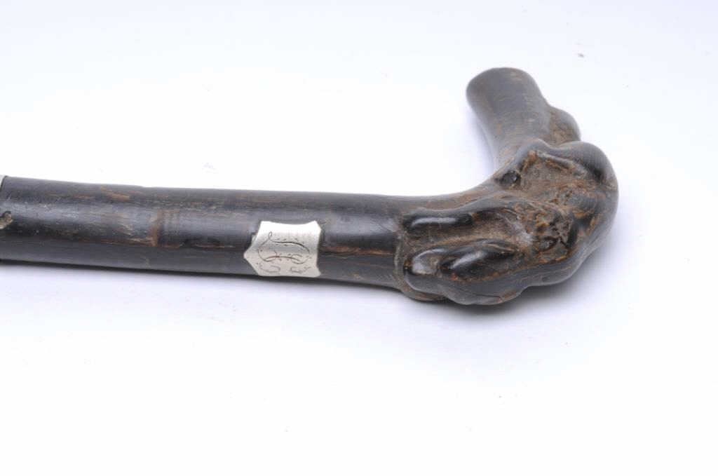 Carved reclining dog in dark horn as grip to antique cane with concealed dagger. Est.: $200-$400