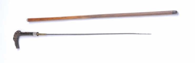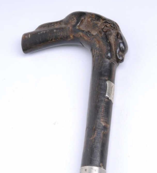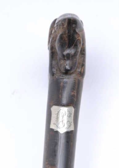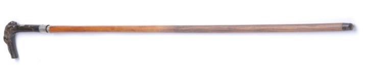 Lot 1003 Carved reclining dog in dark horn as grip to antique cane with concealed dagger. Est.: $200-$400
