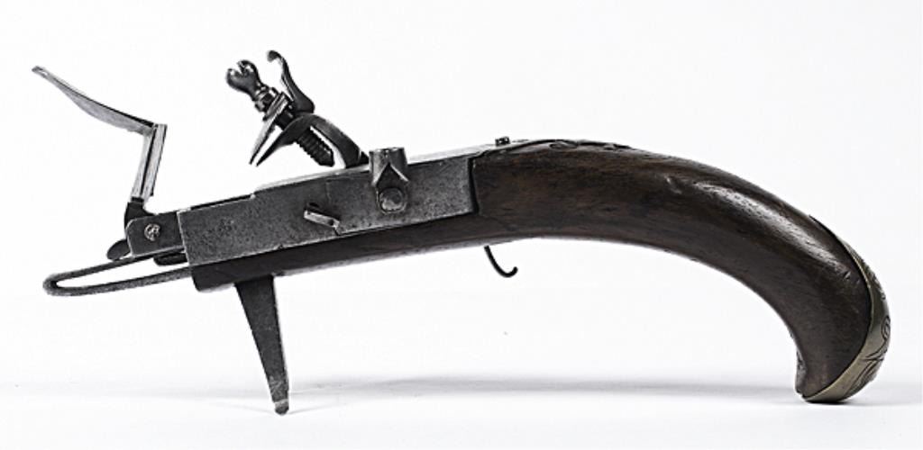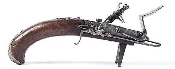 Flintlock Pistol-Shaped Tender Lighter, 9" iron box lock with external works, walnut grip with fleur-de-lis raise carving around the tang and an engraved brass buttplate, mechanically in good order. Good. Normal age and wear. Est:$700-900