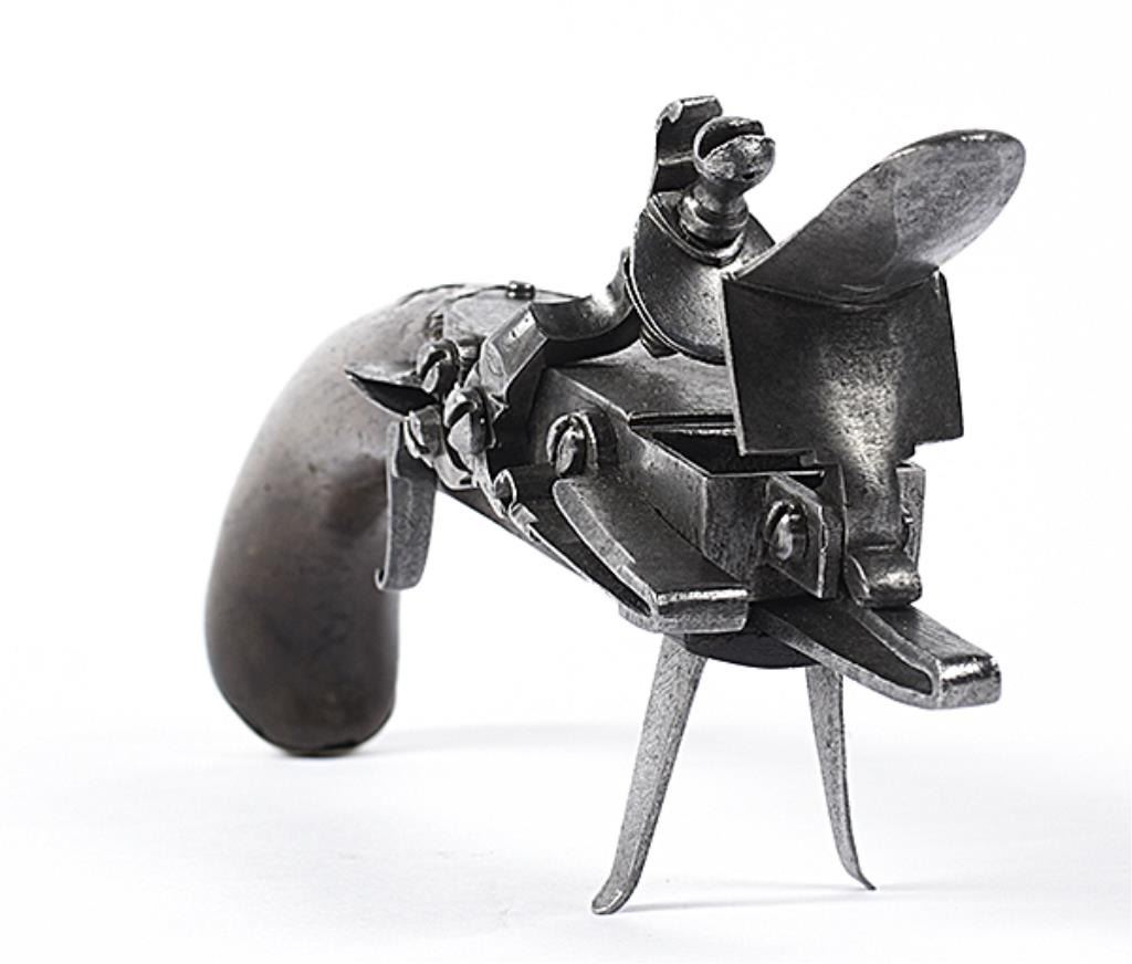 Lot 1006 Flintlock Pistol-Shaped Tender Lighter, 9" iron box lock with external works, walnut grip with fle