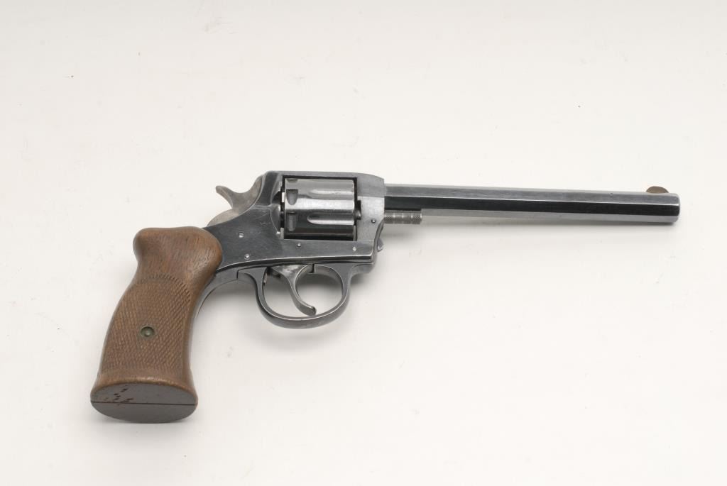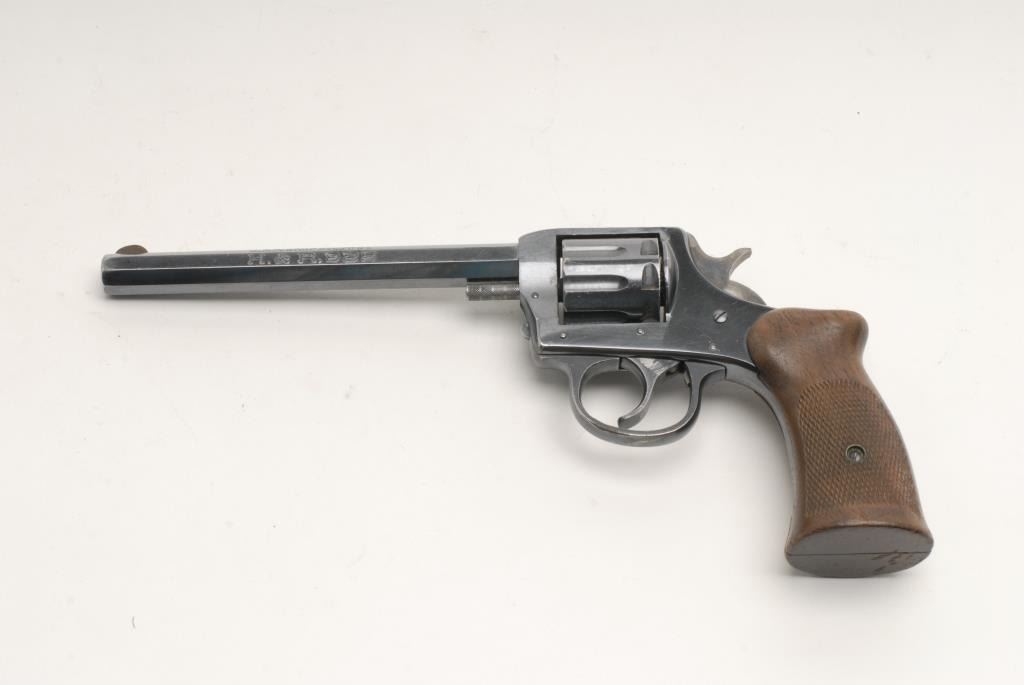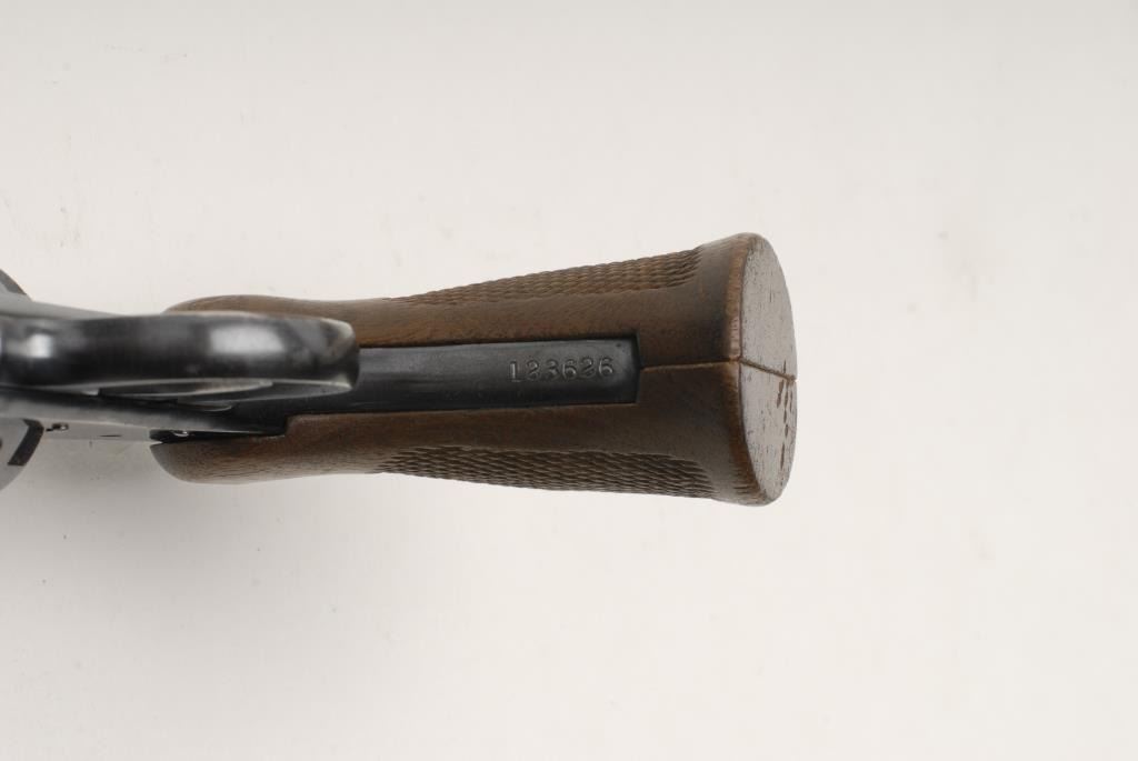 H&R 922 DA revolver, .22 caliber, 6” octagon barrel, S/N 123626, in overall fine condition displaying the majority of its bright original blued finish, very good to fine bore, crisp action and markings, very good checkered wood grips. (Modern/PPT). Est.: $100-$200.