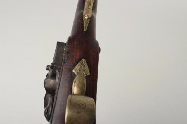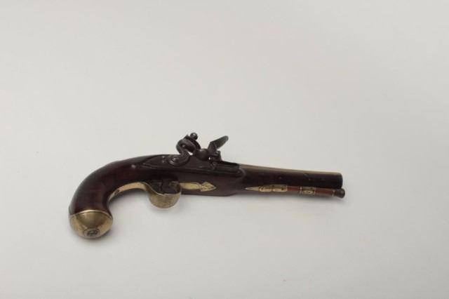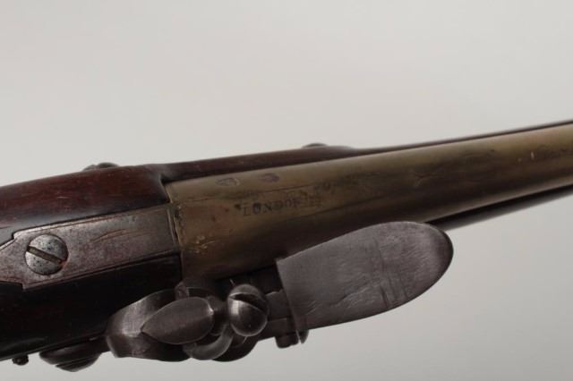 Lot 1020 British Flintlock Pistol by A.W. Spies, .58 caliber, 7.75" brass barrel. The barrel features a cro