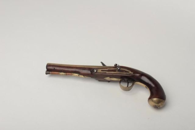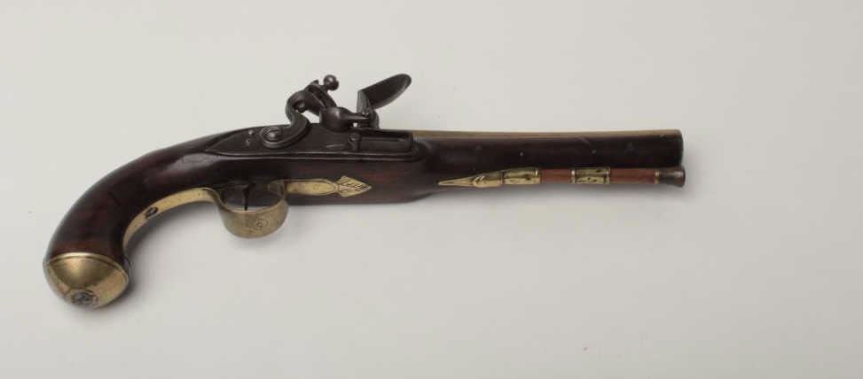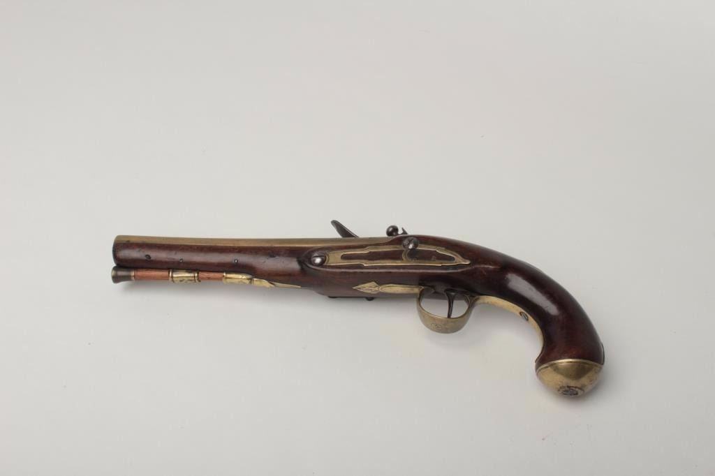 British Flintlock Pistol by A.W. Spies, .58 caliber, 7.75" brass barrel. The barrel features a crown over P and crown over V proof, and is marked London near the breech and is engraved New York towards the muzzle. The lock is marked A.W.Spies, and features an engraved hammer. The brass sideplate has a skeleton design, with engraved borders. Walnut stock with brass tipped ramrod, two brass ferrules, brass triggerguard with finial, brass butt cap and brass thumbprint. Thebrass has an old mustard patina. The stock has some light nicks and dings. The pistol functions mechanically. Est:$600-800