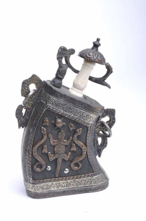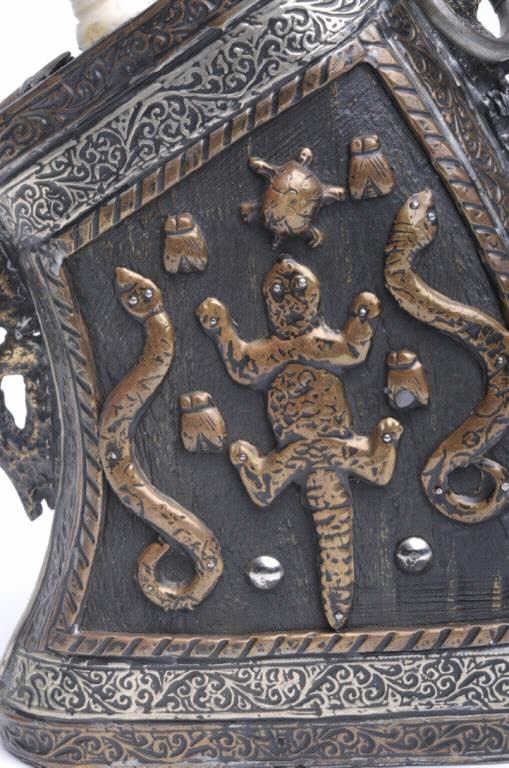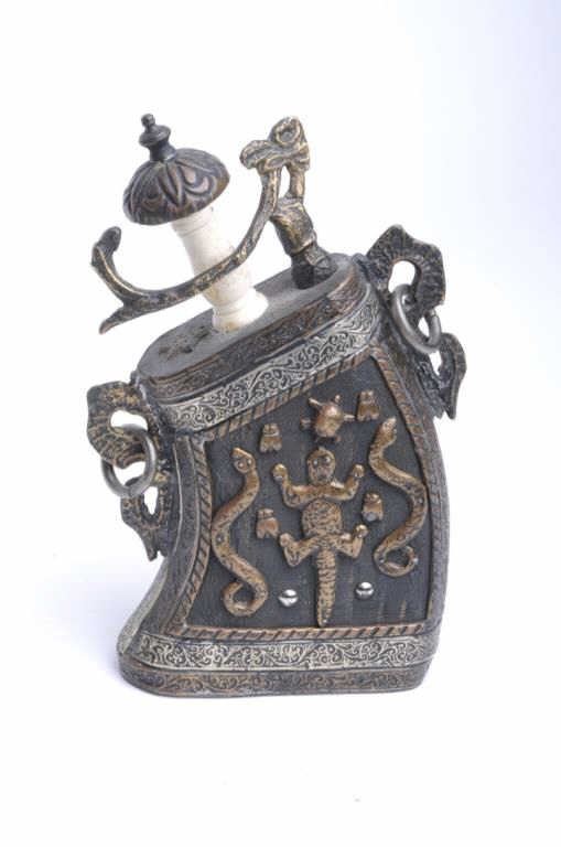 Impressive and ornate 19th century powder flask with bone spout probably central to North Africa with silver and brass overlays with figurals of snakes, turtles, bugs, and possibly a lemur. Measures 11” from tip to bottom. The quality befitting a king or chief. Est.: $300-$600