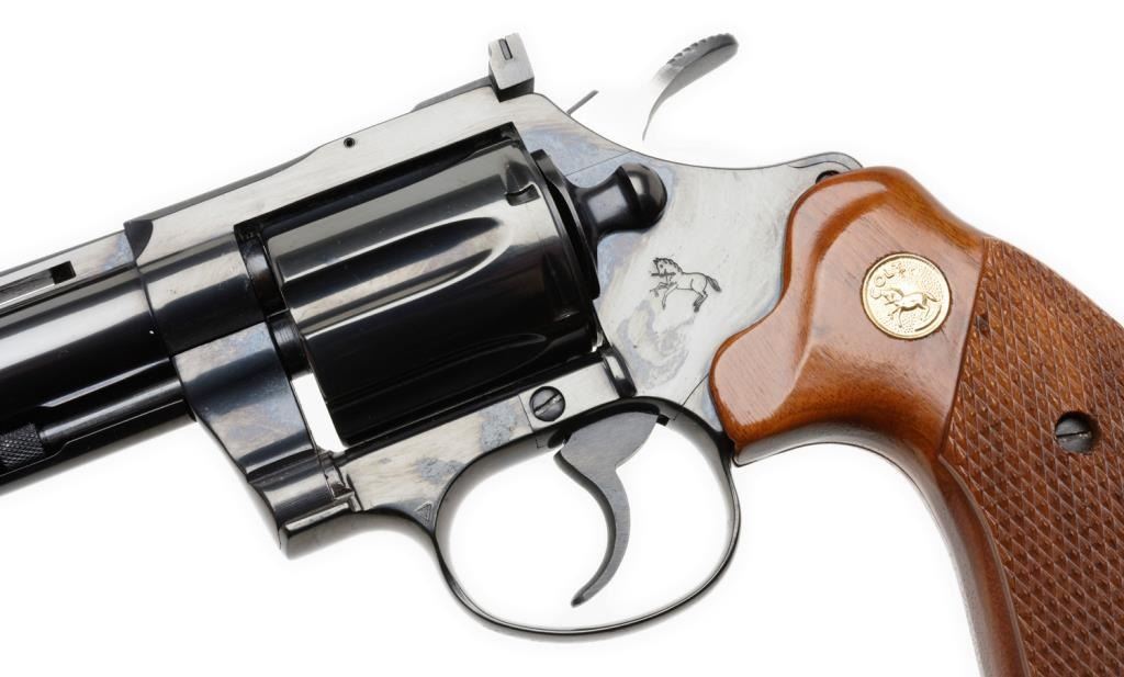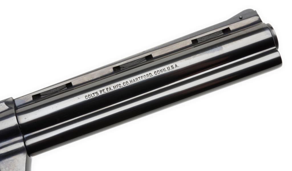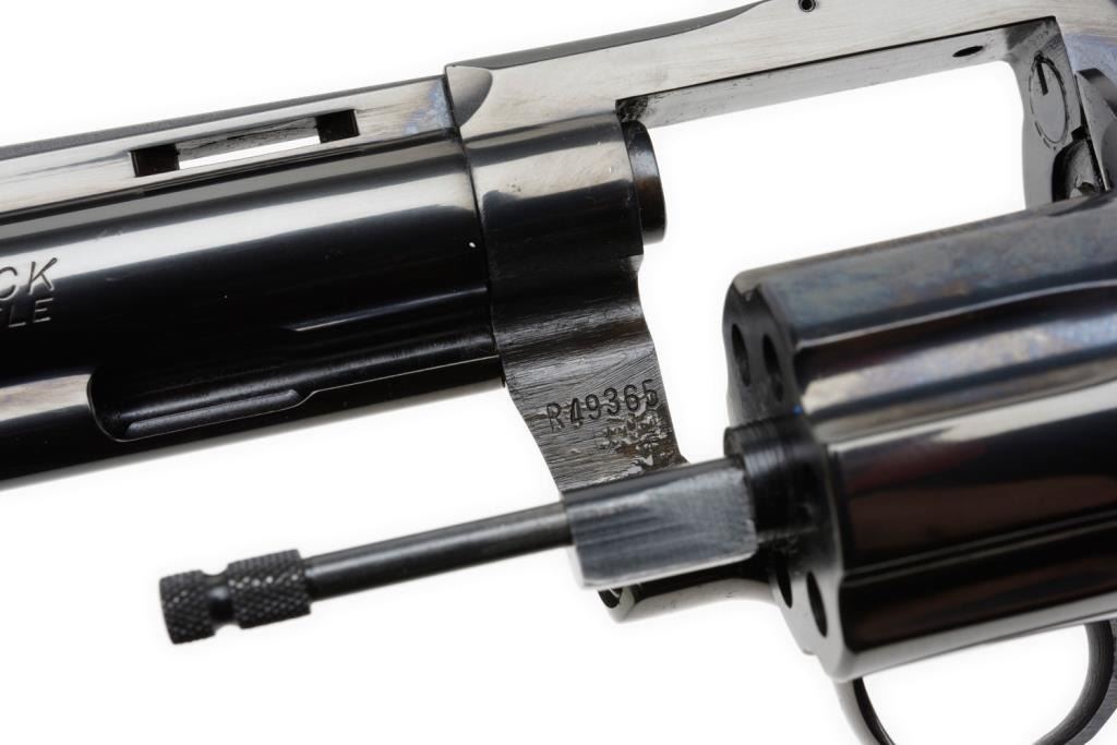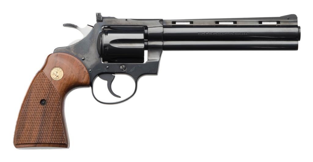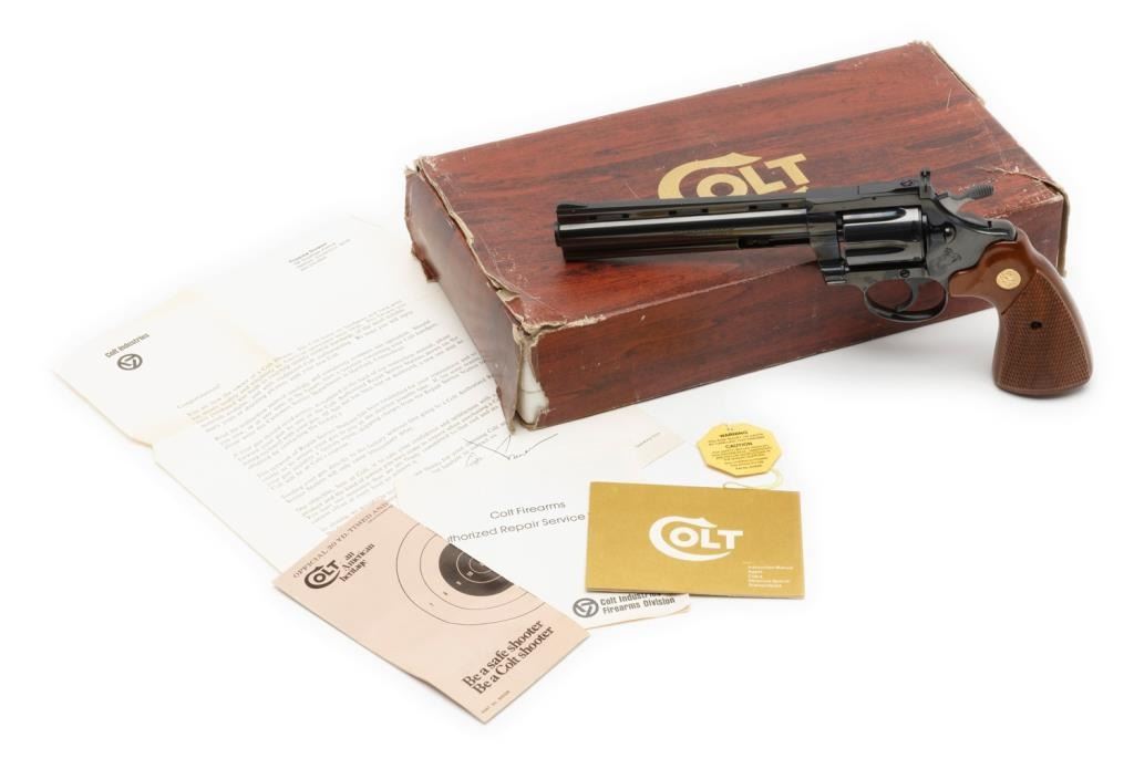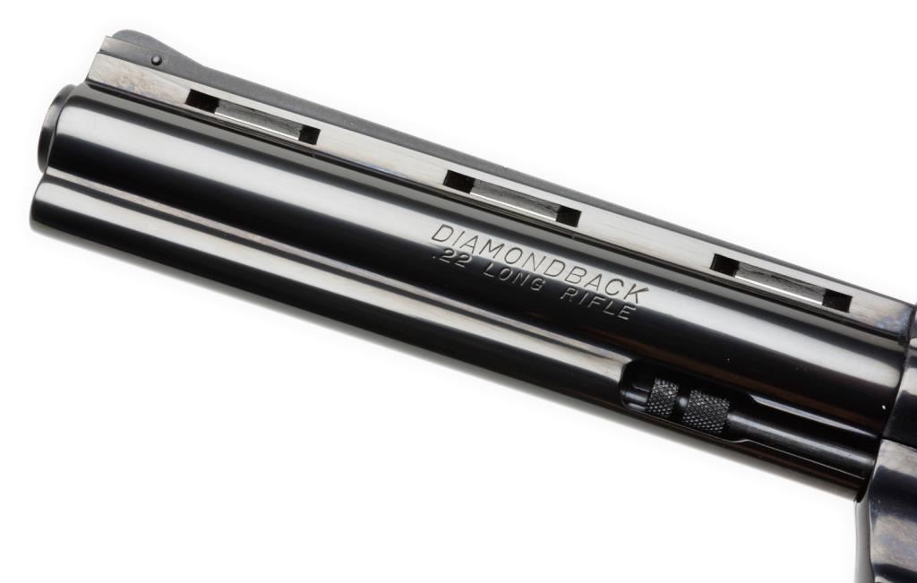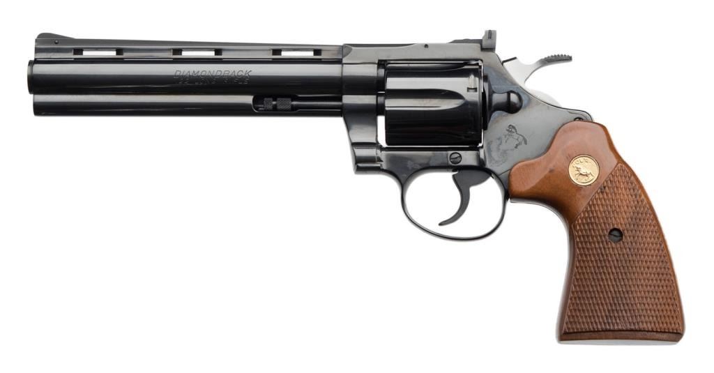 ++Colt Diamondback Model DA revolver, .22LR caliber, 6” ventilated rib barrel, S/N R49365, blued finish, checkered wood medallion combat grips with instructions, factory wood grained cardboard box and Styrofoam inserts. This gun isin like new condition showing little handling. The box end label is numbered to this gun; scattered scuffing and tears to box. Est.: $600-$1,200.