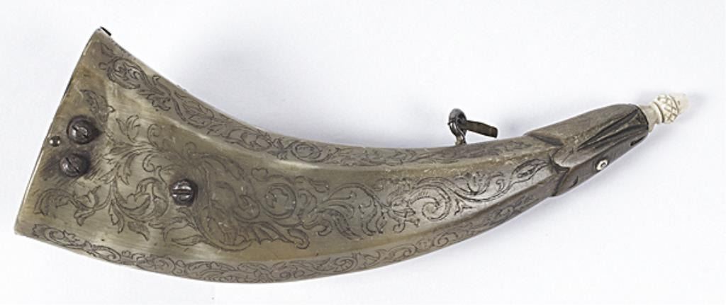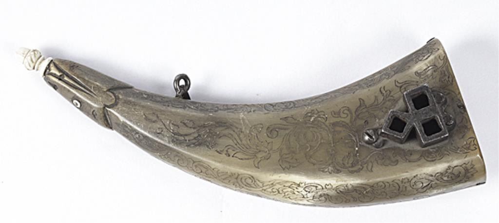 powder horn with floral design and screw in spout with miquelet lock wrench mounted on horn, very good, small cracks at butt cap. Est$150-250