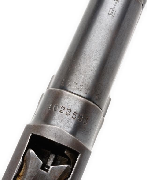 *Winchester Model 12 Take Down pump action shotgun, 12 gauge, serial #1023586. The shotgun is in overall very good condition with a 30” blued barrel with full-length filed rib and brass bead front sight. The barrel and receiver retain themajority of their thinning blued finish with some slight surface rust noted on the action. The smooth wood stocks are in very good condition with only slight mars consistent with field use and a Winchester marked hard rubber butt plate providing a 14” LOP. The bore is very good, action crisp and markings sharp on this desirable Model 12. $500-$700.