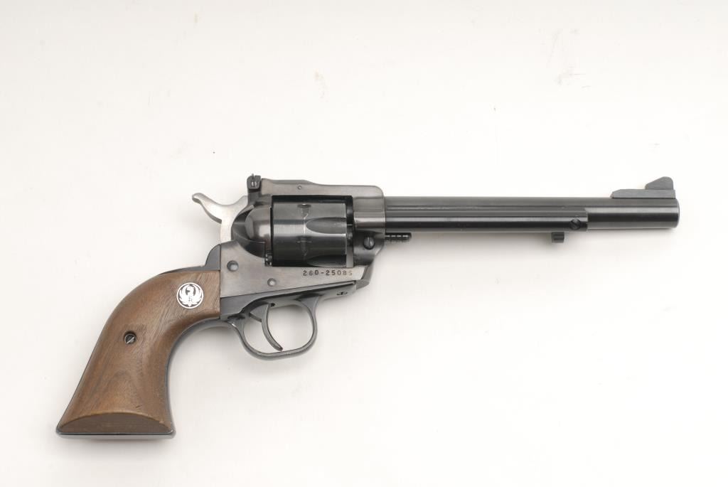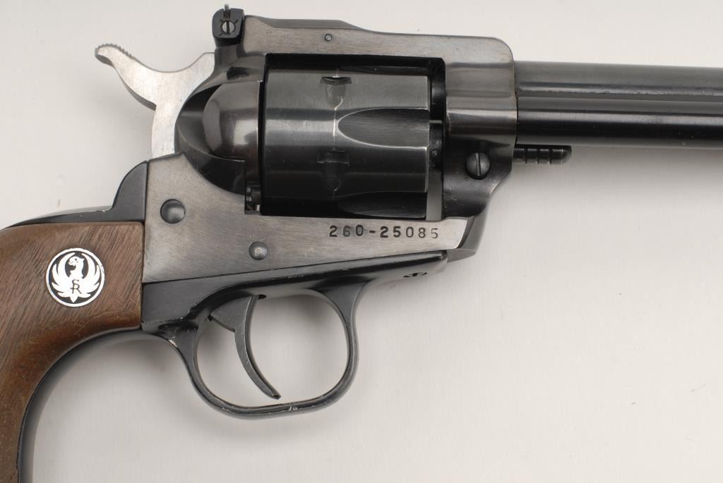 Ruger Single Six revolver, .22 cal., serial #260-25085. The pistol is in very good condition with a 6 ½” barrel. The barrel retains nearly all of its blued finish with ramp front and adjustable rear sights. The smooth wood medallion grips are in very good condition with small mars and compressions consistent with use. The bore is very good, the action is crisp and markings are sharp. Est.: $250-500. (Modern).
