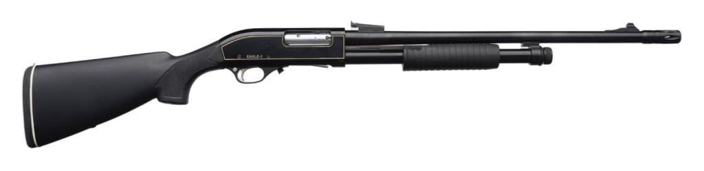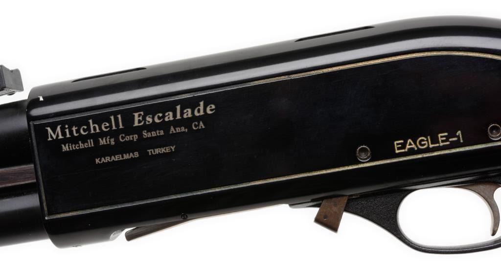 *Mitchell Escalade Model Eagle-1 pump action shotgun, 12 gauge, serial #38175. The shotgun is in overall very good condition with a 23” barrel with birdcage style muzzle break and rifle sights. The barrel and action retain nearly all of their black finish. The receiver is marked, “KARAELMAS, TURKEY.” The black synthetic s butt stock and fore end are in very good condition showing only minor handling marks. The buttstock ends with a rubber butt pad and 14 ¼” LOP. Thebore is good, the action crisp and markings are sharp on this shotgun. Est.: $250-$400.