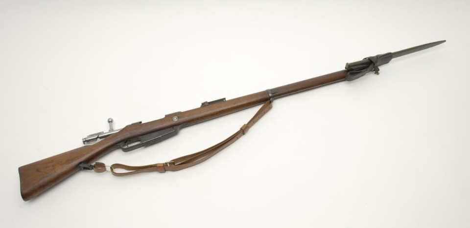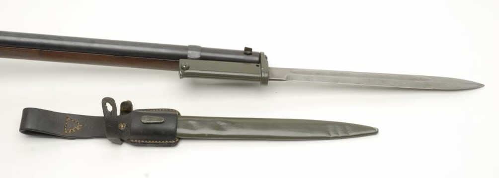 German Model 88 bolt action rifle, marked Danzig and dated 1890, 8mm caliber, 30” barrel, S/N 223 in overall good condition showing an old re-blue, good action and markings, very good bore, good wood stock with bayonet, metal sheath and leatherhanger. (Antique). Est.: $200-$400.
