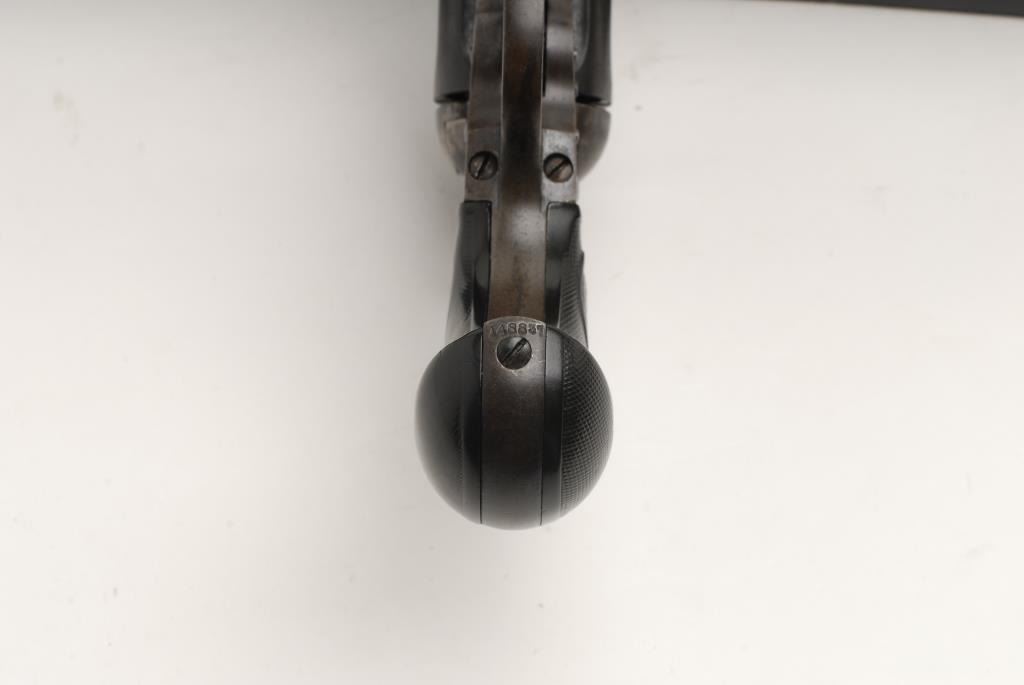 Colt Model 1877 Thunderer DA revolver, .41 caliber, 4.5” barrel, S/N 148837, in overall good condition showing a dark patina to barrel assembly, cylinder and straps with some traces of original blue in protected areas; dark patina andsome silvery tone to case hardened frame, very good action, sharp markings, good grips with more wear to right side. (C&R). Est.: $700-$1,400.