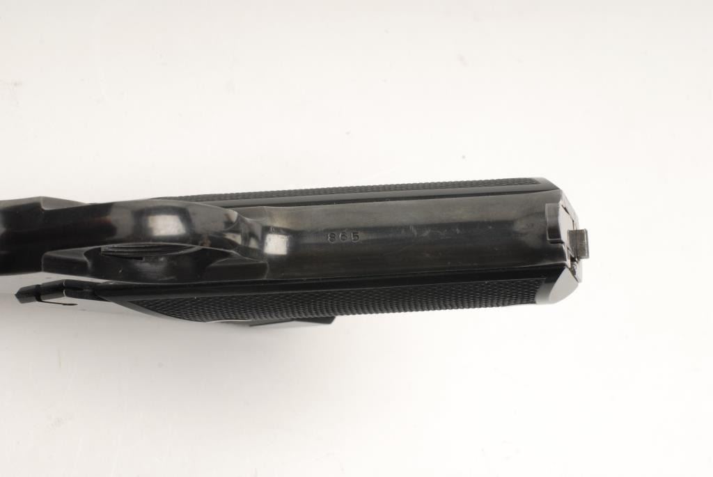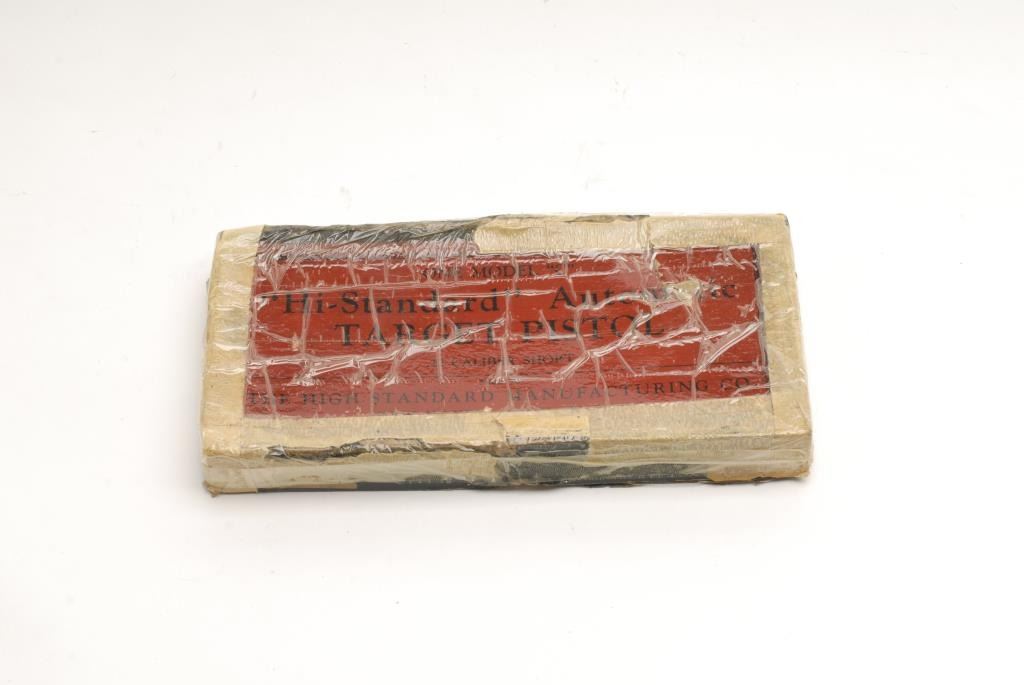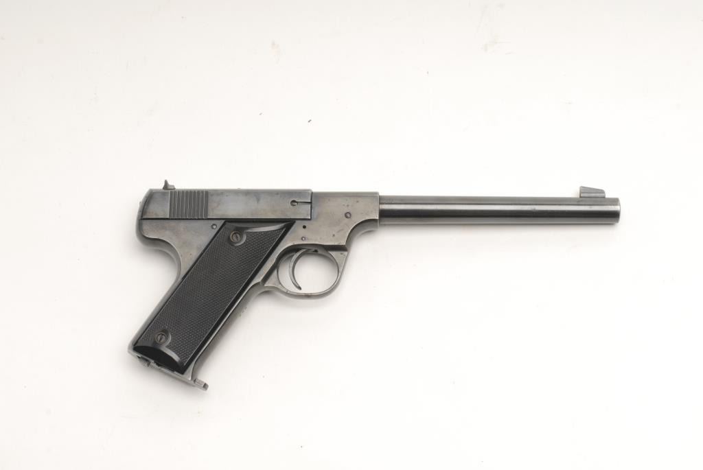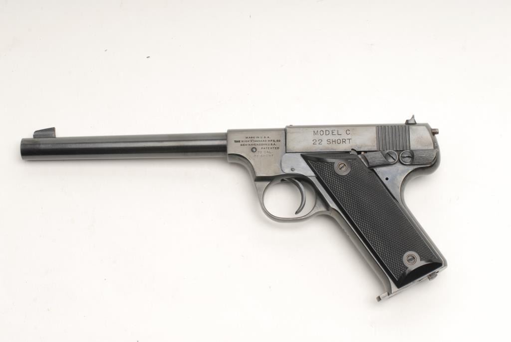 High Standard Model C semi-automatic pistol, .22 short caliber, 6.75” round barrel, S/N 865, in overall fine condition displaying the majority of its original blued finish, fine bore, action, markings and grips; accompanied by a factory twopiece cardboard box that has been heavily taped and repaired. (C&R). Est.: $600-$1,200.