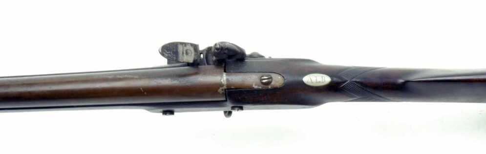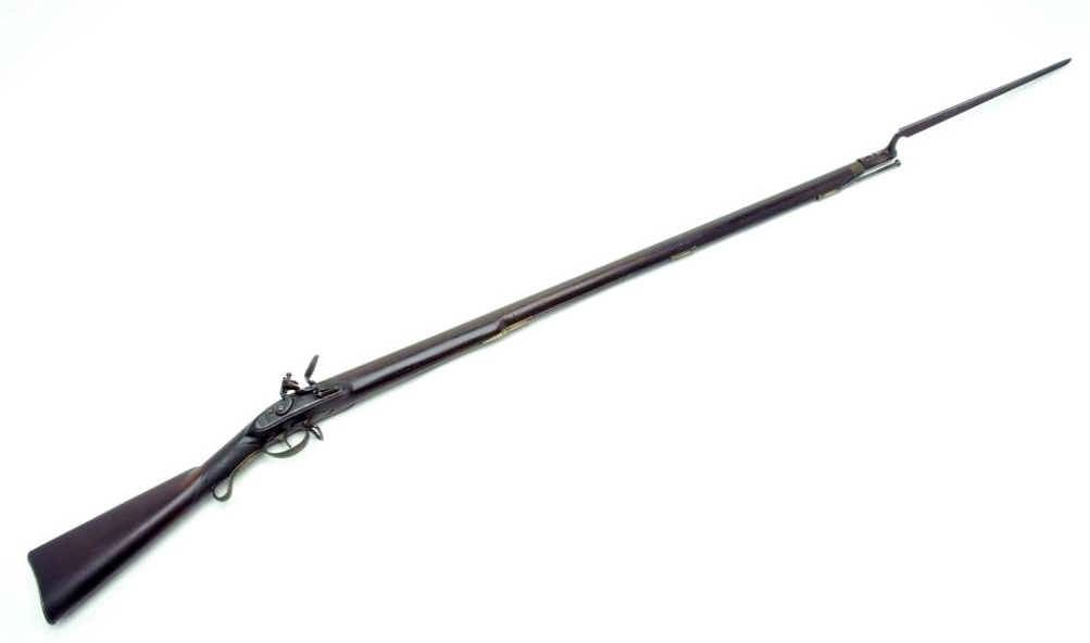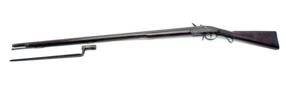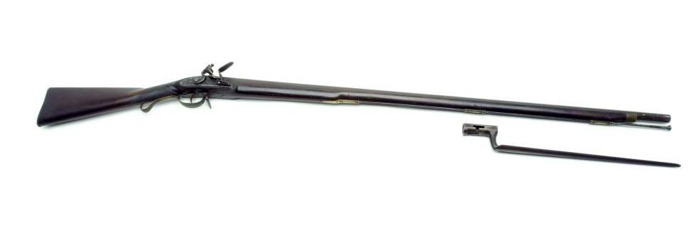 Flintlock full stocked rifle with I.P. Moore lock, .69 caliber, 42” barrel, browned finish, brass mounted, checkered wrist, with U.S. marked socket bayonet, sometimes called a New England musket, in overall very good condition with crisp action,majority of brown finish remaining on barrel, very good wood with escutcheon at top of wrist showing “ALB” initials; socket bayonet has TA inspection (per consignor, early U.S. inspector Thomas Annaly. Accompanied by note from consignorindicating obtained from an old dealer in Shreveport, LA. 55 years ago who reported the gun came out of an old plantation house in Georgia. The consignor also noted the gun was loaded when he bought it with lead shot that was hand droppedand wadded with newspaper; he removed the load but the paper was too far gone to find a date. (Antique). Est.: $900-$1,800.