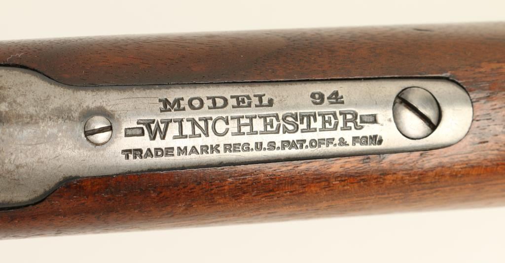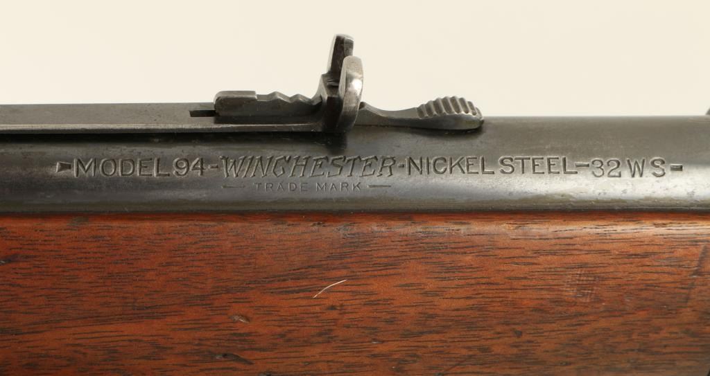 Winchester Model 94 lever action rifle, .32 W.S. caliber, 26” round barrel, S/N 1005093, blued finish, wood stocks in overall very good condition showing considerable original blue on the barrel assembly, crisp action and markings, fine bore,very good wood stock with normal wear. (C&R). Est.: $700-$1,400.