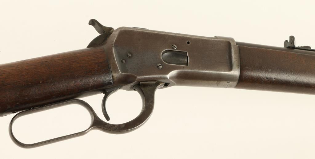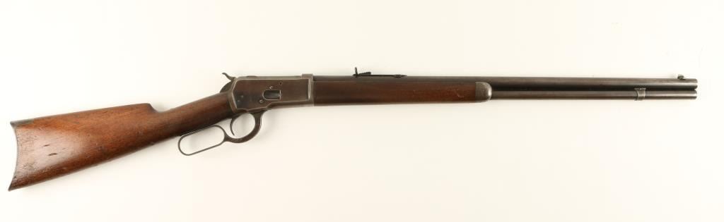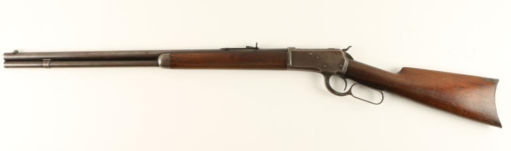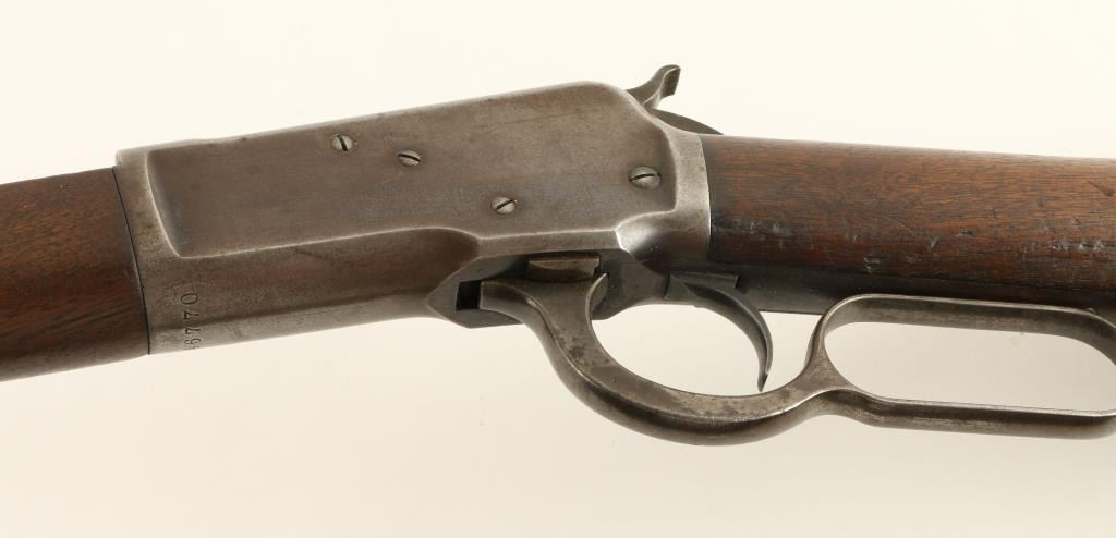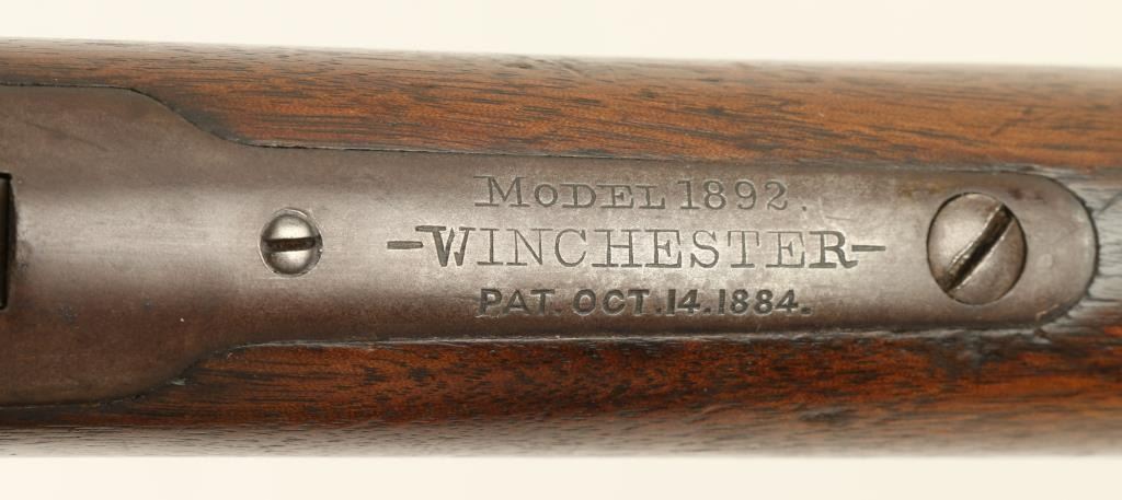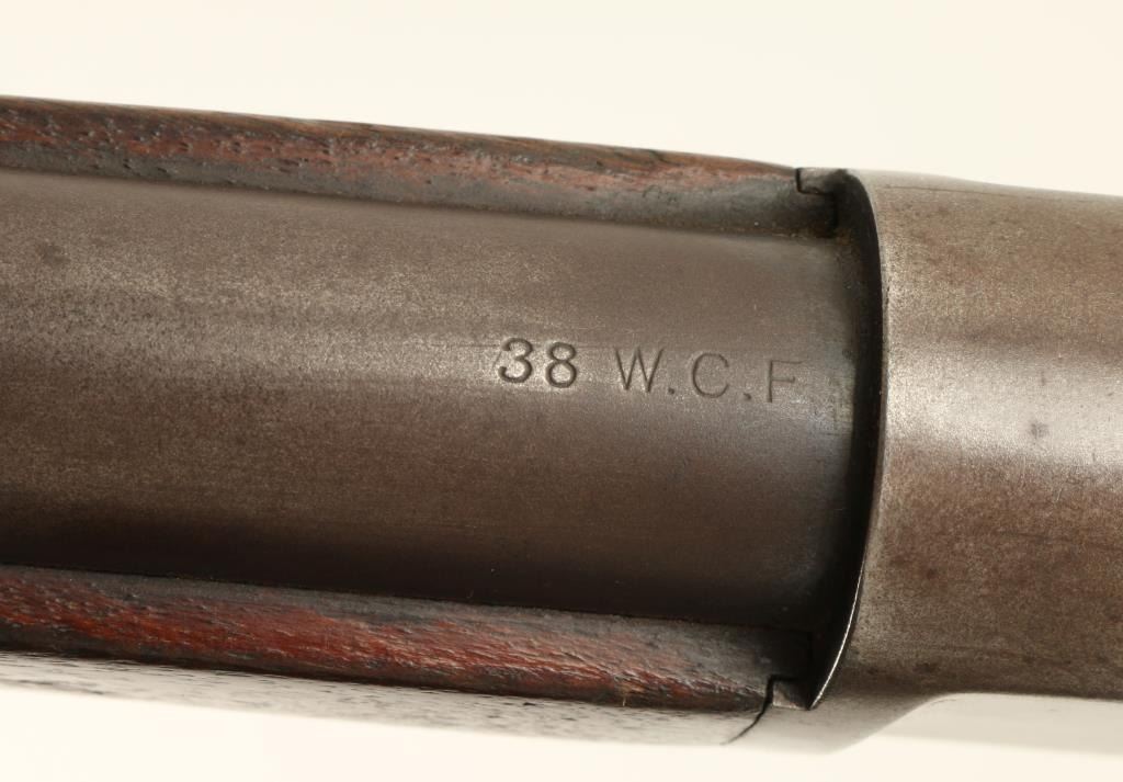 Winchester Model 1892 lever action rifle, .38 W.C.F. caliber, 24” round barrel, S/N 46770, blued finish, wood stocks in overall very good condition showing a dark un-cleaned patina on metal surfaces with some scattered areas oforiginal blue; overall good bore, crisp action, good markings and very good wood with minor scattered scratches and mars from storage. (Antique). Est.: $700-$1,400.