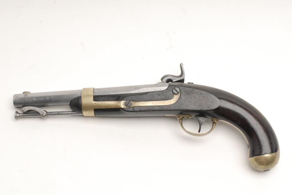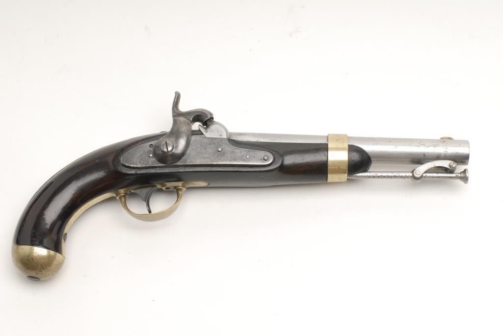 Lot 1175 U.S. military single shot percussion pistol by Aston, .54 caliber, 8.5” barrel, brass mounts, wood