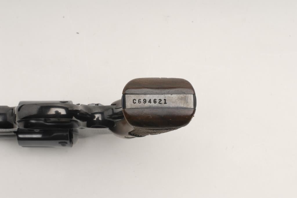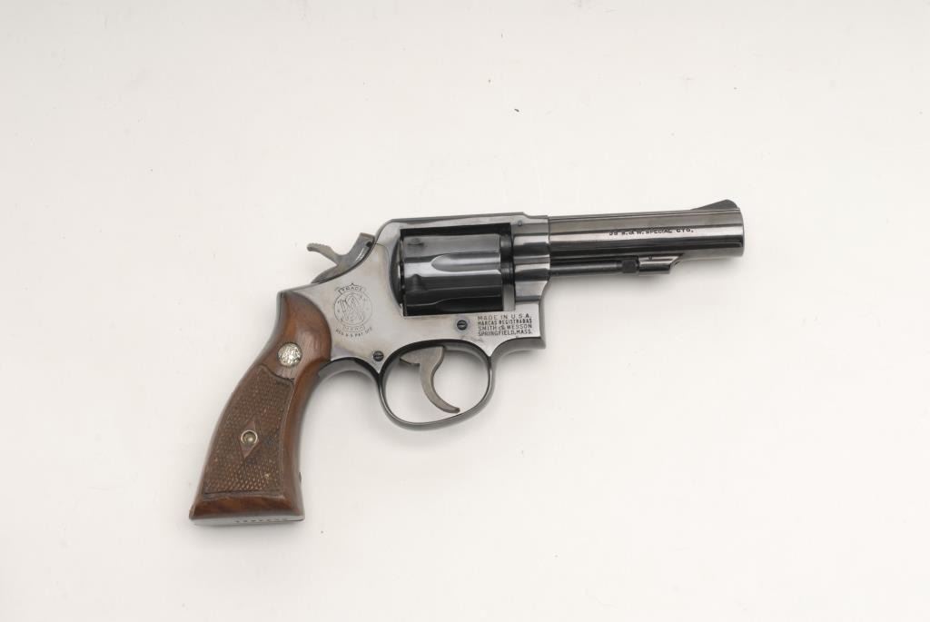 Smith and Wesson Model 10 revolver, .38 Special cal., serial #C694621. The pistol is in very good condition with a 4” barrel with a ramp front sight. The barrel and frame retain nearly all of their polished blue finish. The top of the barrel and top strap are done in a matte blue to reduce reflection. The trigger and hammer still show significant bright case color. The cylinder has only a faint drag line as this pistol has seen little use. The checkered, medallion wood gripsare in very good overall condition with small mars and compressions consistent with use. The bore is very good, the action is crisp and the markings are sharp on this nice Model 10. Est.: $275-$375. (Modern).