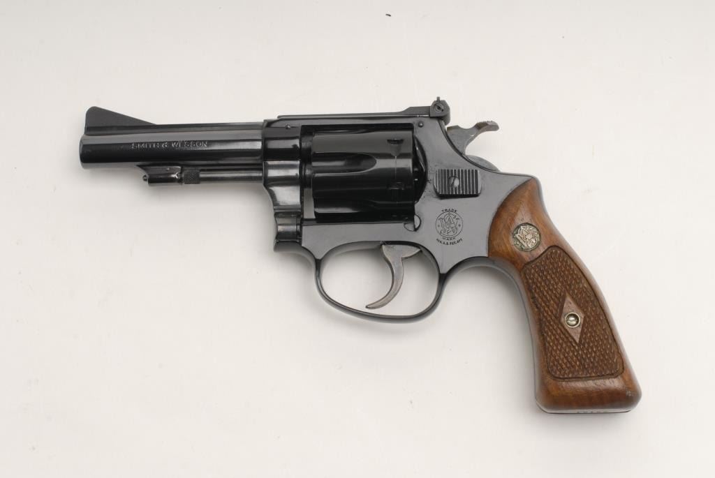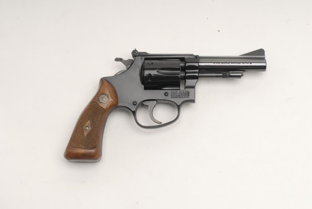 Smith and Wesson Model 43 revolver, .22 Long Rifle cal., serial #72152. The pistol is in fine to nearly excellent condition with a 3 ½” barrel with a ramp front and adjustable rear sights. The barrel and receiver return nearly all of theirpolished blue finish with only slight handling marks. The cylinder has only a faint drag line. The pistol appears to have little if any use. The checkered wood medallion grips are in very good condition with only small mars from storage. Thebore is excellent, the action crisp and markings are sharp. Est.: $275-$475. (Modern).