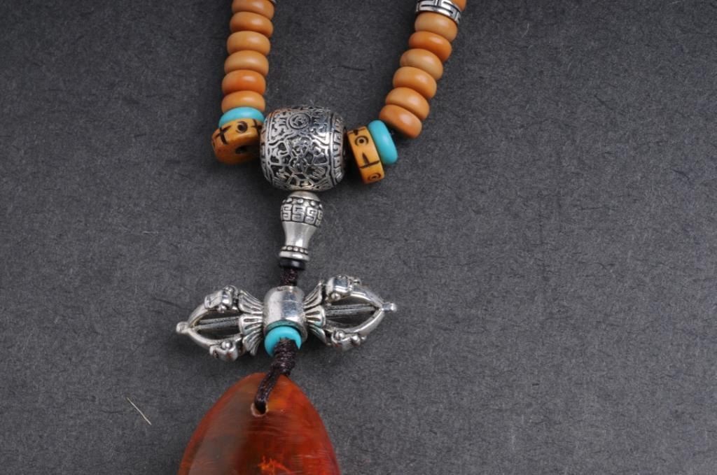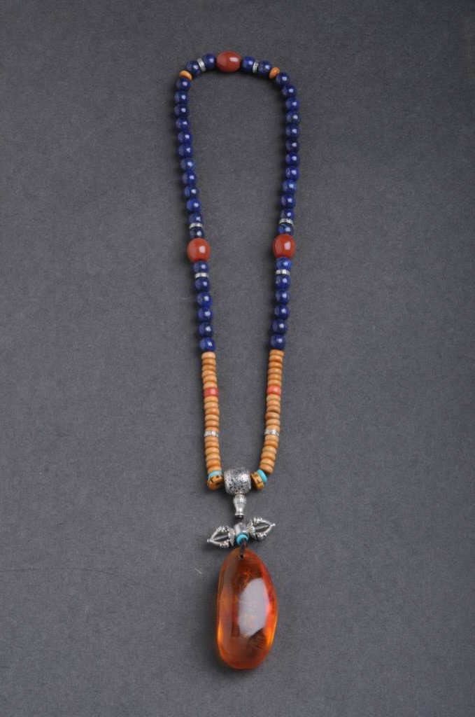 Lot 1195 One unique necklace made of lapis, agate, silver beads and decorations with a Amber embedded with a