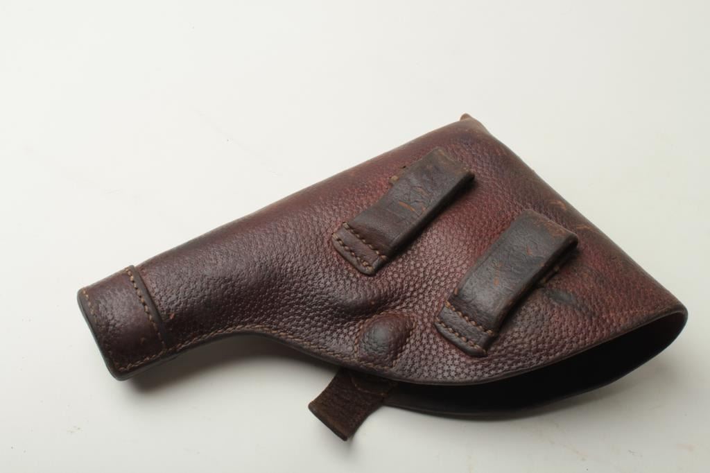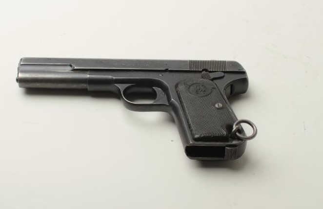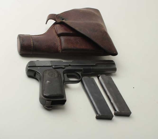 Husqvarna Model 1907 Semi-Auto pistol, .380 caliber, 5” barrel, mat black finish, checkered hard rubber grips, S/N 8828. This pistol remains in overall good condition with majority of the finish going to gray and wear at the edges. Thegrips remain in fair condition with wear, dings and scratches along with toning of color on the right grip. The bore is in good condition and would benefit from a good cleaning. The action is crisp and the markings are sharp. Also included is a flap holster and 2 mags. (C&R/PPT). Est.: $300-$600