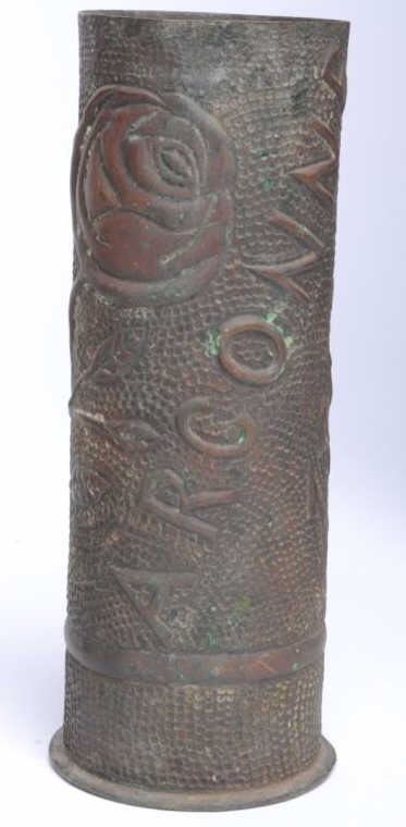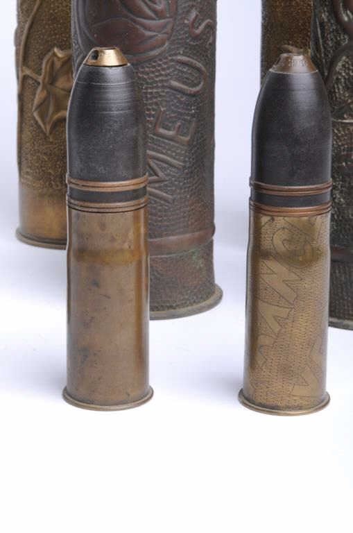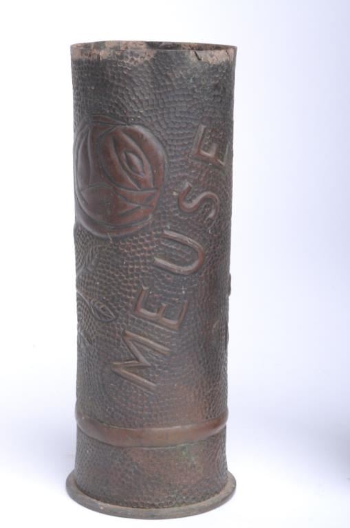 Lot of Trench Art and old battlefield projectile, 7 pieces total; per consignor, brought home from WW I by A.C. Whittington and kept in the family until now. Est.: $200-$500.