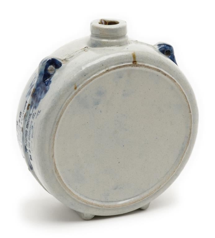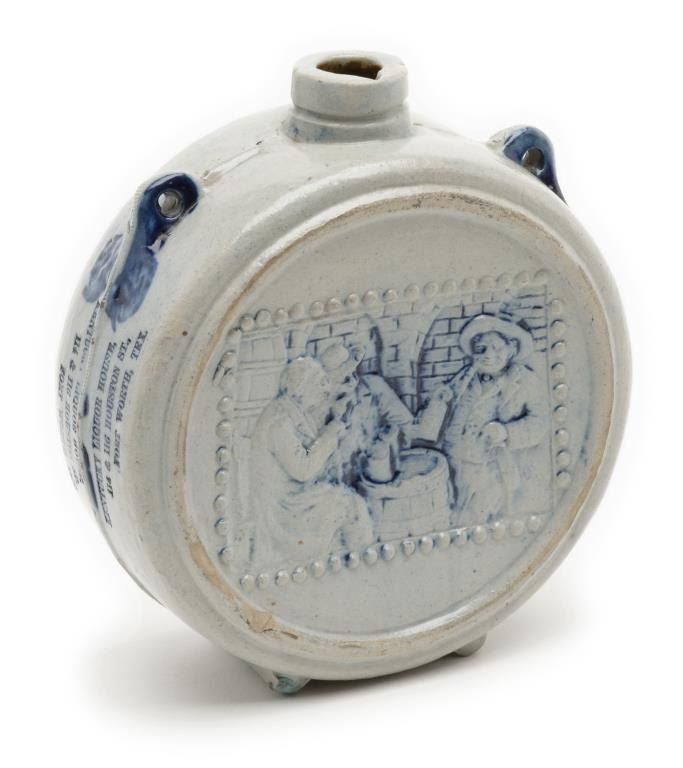 Pottery canteen marked “Kentucky Liquor House, 114 & 116 Houston St., Fort Worth, Tex”; approximately 7” in diameter and in overall very good to fine condition. Est.: $300-$600.