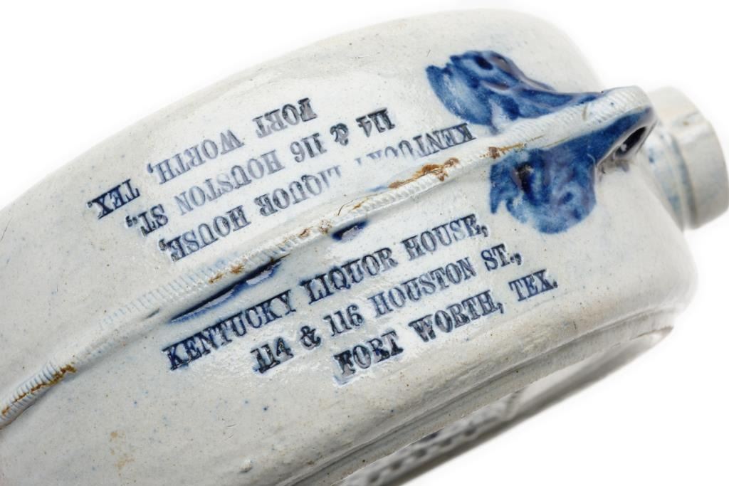 Lot 1212 Pottery canteen marked “Kentucky Liquor House, 114 & 116 Houston St., Fort Worth, Tex”; approximat