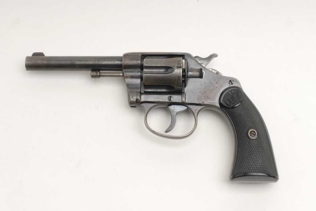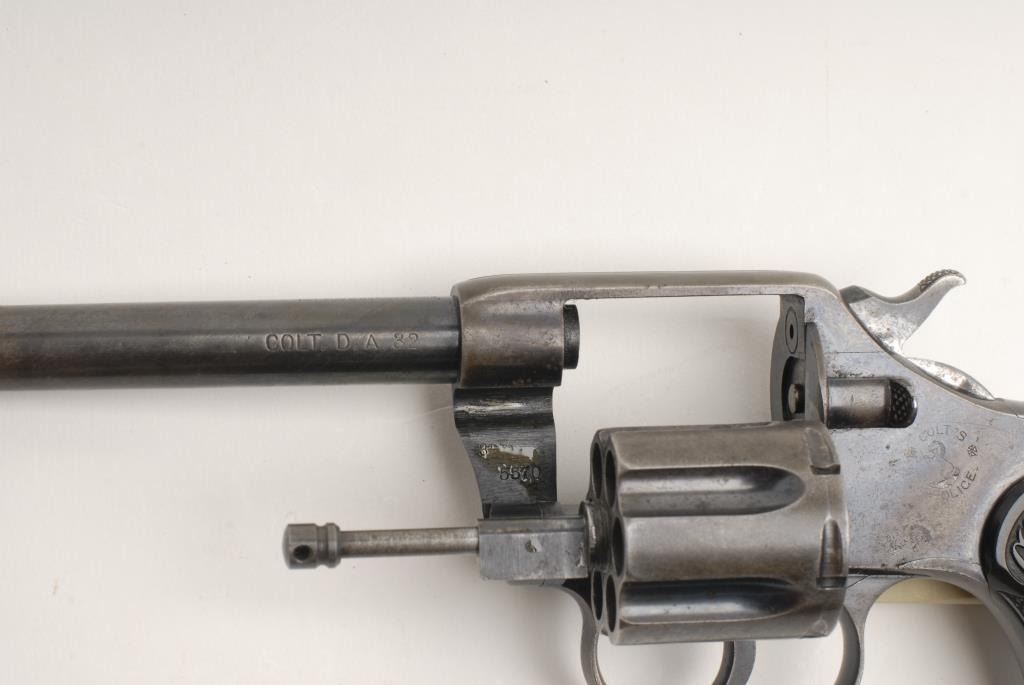 Colt Model New Police revolver, .32 cal., serial #5570. The pistol is in very good overall condition with a 4” blued barrel. The pistol retains a significant of its original muted blue finish with wear at the muzzle and the front sight having been reduced in height. The Rampant Colt emblem is visible and all markings are legible. The checkered hard rubber grips are in good overall condition with a small chip missing from the right panel. The bore is very good and action crisp on this Colt manufactured in 1899. Est.: $250-$500. (C+R).