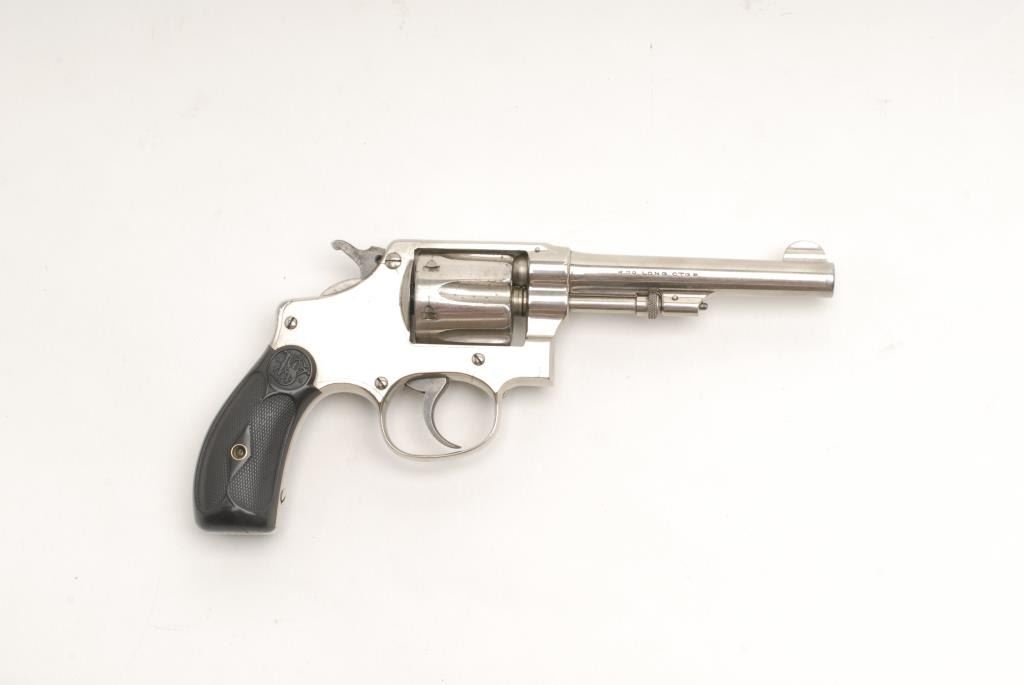 Smith and Wesson Hand Ejector revolver, .32 Long cal., serial #264741. The pistol is in very good to nearly fine overall condition with a 4” barrel. The pistol retains nearly all of its original polished nickel finish with light scratches on the frame and wears at the muzzle. The trigger and hammer still show muted case colors. The checkered hard rubber grips are in very good condition with only handling marks, although they differ slightly in color. The bore is very good,the action crisp and markings are sharp. Est.: $300-$600. (C+R).