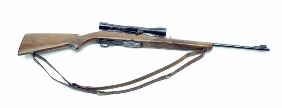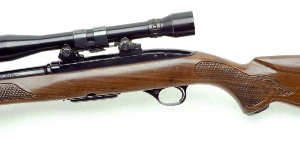 Winchester Model 100 semi-automatic rifle, .308 Win. caliber, 22” round barrel, S/N 133774, blued finish, wood stock with leather sling and mounted with a Bausch & Lomb scope displaying fine optics. This rifle is in overall fine condition showingthe majority of its original finish, fine bore, action, markings and wood. (Modern/PPT). Est.: $500-$1,000.