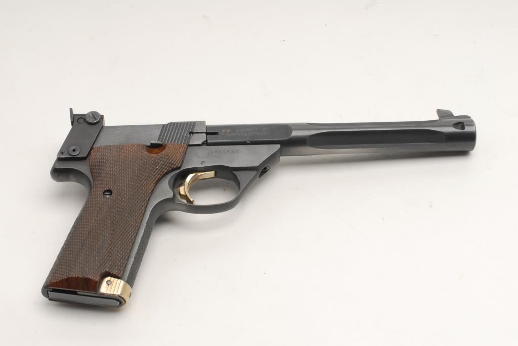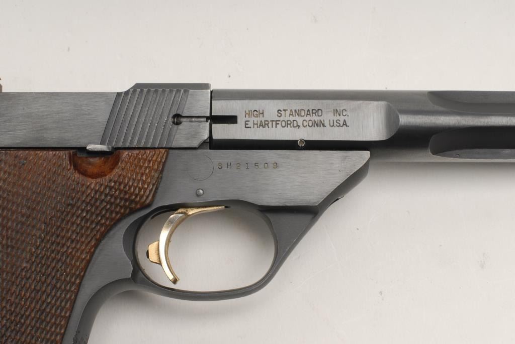 High Standard Supermatic Trophy Model semi-automatic target pistol, .22LR caliber, 7.25” barrel, S/N SH 21509, blued finish, checkered wood thumbrest grips, gold accents in overall excellent condition displaying 99%+ originalfinish, fine bore, action, markings and grips. (Modern/PPT). Est.: $400-$800.