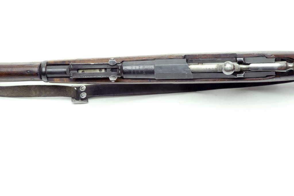 Russian Armory Mosin-Nagant bolt action rifle, 9mm caliber, 32” barrel, S/N 96023, military finish, wood stock in overall good condition with a good bore, crisp action, good markings and fair to good wood stock showing an old repair to the bottomarea of the butt stock; leather sling included. (C&R). Est.: $200-$400.