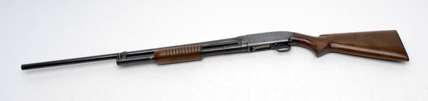 Winchester Model 12 pump action takedown shotgun, 16 gauge, 28” barrel, S/N 1209864, blued finish, wood stocks in overall very good + condition showing the majority of its original blue finish, crisp action, sharp markings, near fine bore andvery good + wood with normal wear. (Modern). Est.: $200-$400.