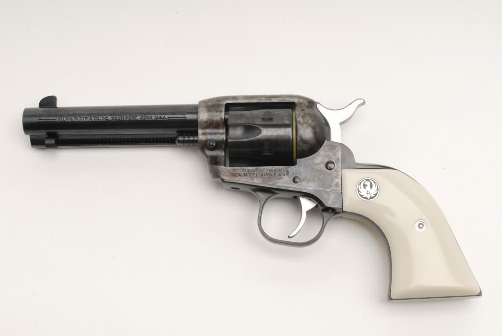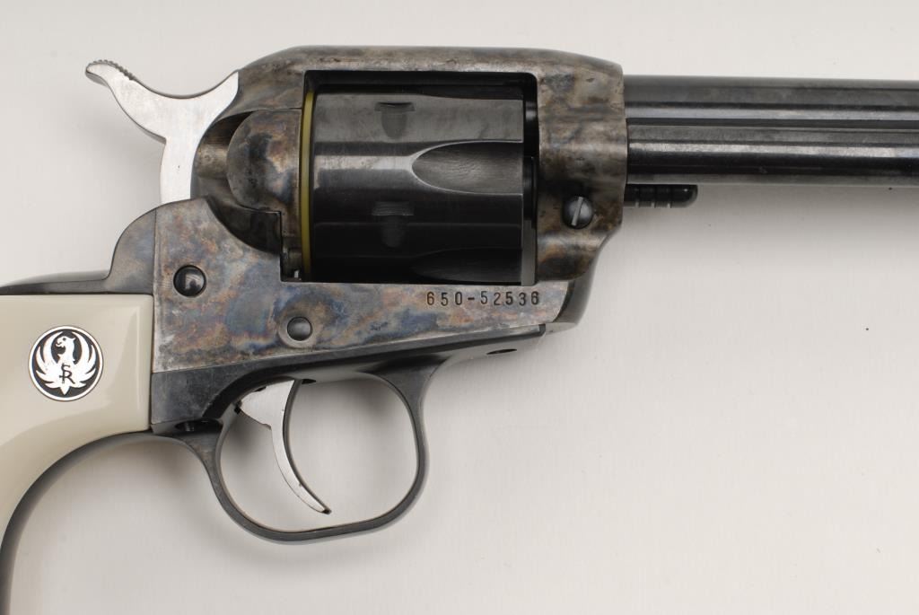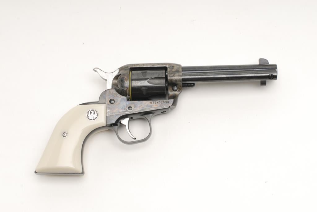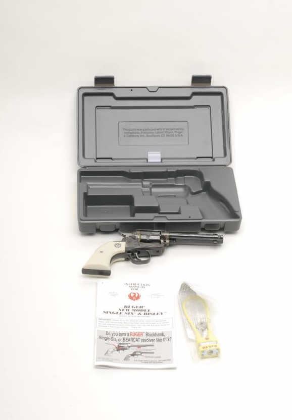 Ruger New Model Single Six Single Action Revolver, .32 H&R Mag., 4 5/8” barrel, blue and case colored finish, faux ivory grips, S/N 650-52536. This revolver remains in like new condition showing little handling and no use. Original boxand manual included. (Exempt) Est.: $200-$400