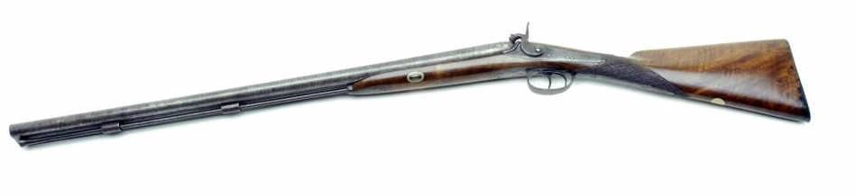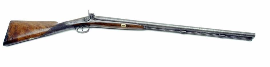 Lot 1291 English SxS percussion shotgun by William Moore, 12 gauge, 28” damascus barrels, no visible S/N, c