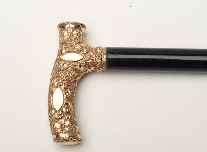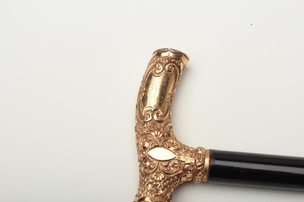 Lot 1307a Walking stick with gold filled fancy cane head inscribed “Major Cowles, From Members, Omadi Lodge