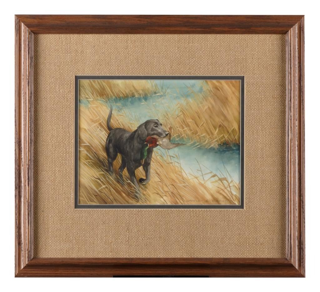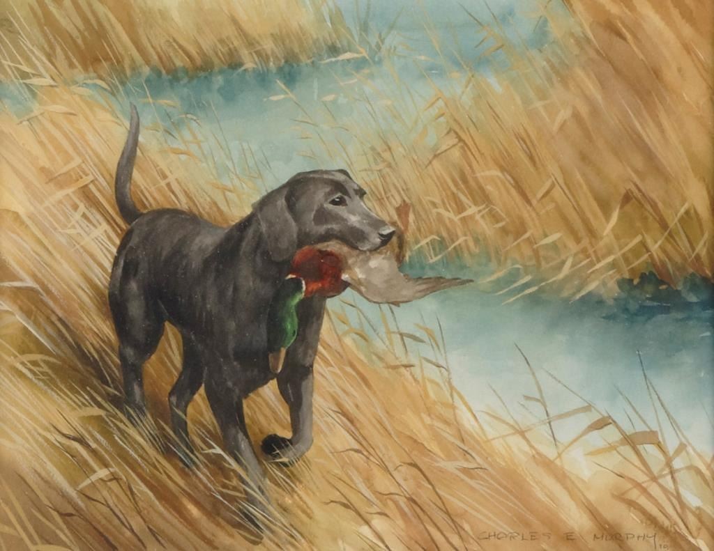 Framed and matted watercolor of a retriever and mallard by Charles E. Murphy, dated 1970 in overall fine condition, approx. 16-1/2” x 18” overall. Est.: $100-$150.