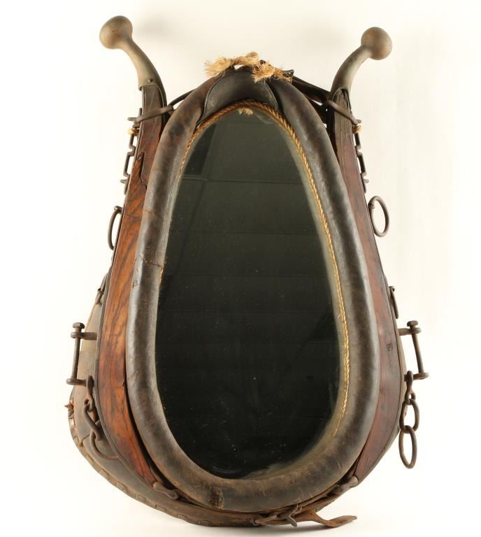 Horse collar mirror measuring 31” tall. Shows age and would be great for rustic western décor. Est.: $75-$150