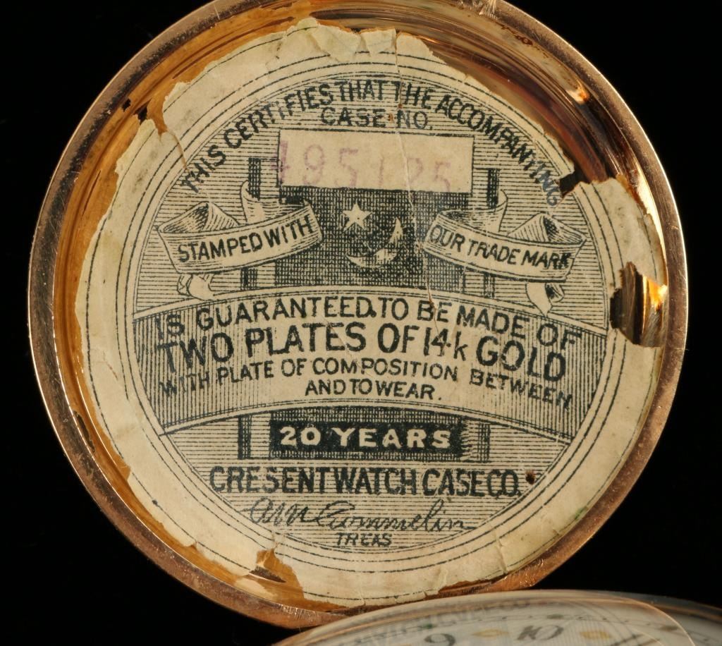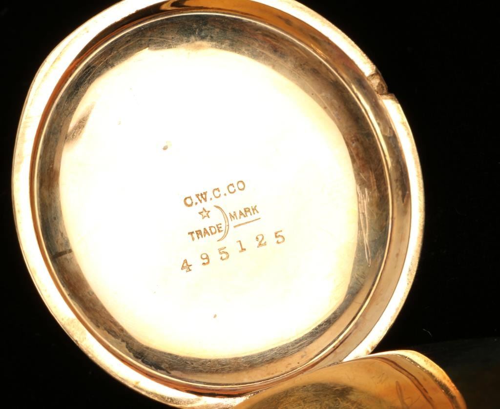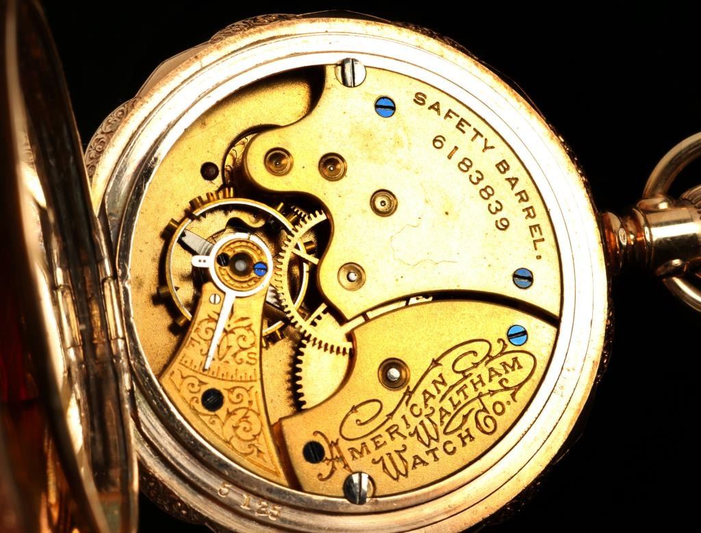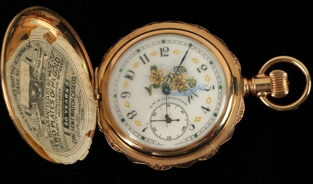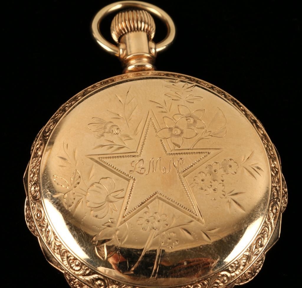 Beautiful Waltham gold filled pocket watch, approximately 1.75” in diameter, beautifully engraved on the outside casing with initials “LMN” in center star on one side and a mountain and lake scene inside the center star on the reverseside; finely enameled face, old paper advertising label on inside of face cover; partially running at time of description. Est.: $175-$350.