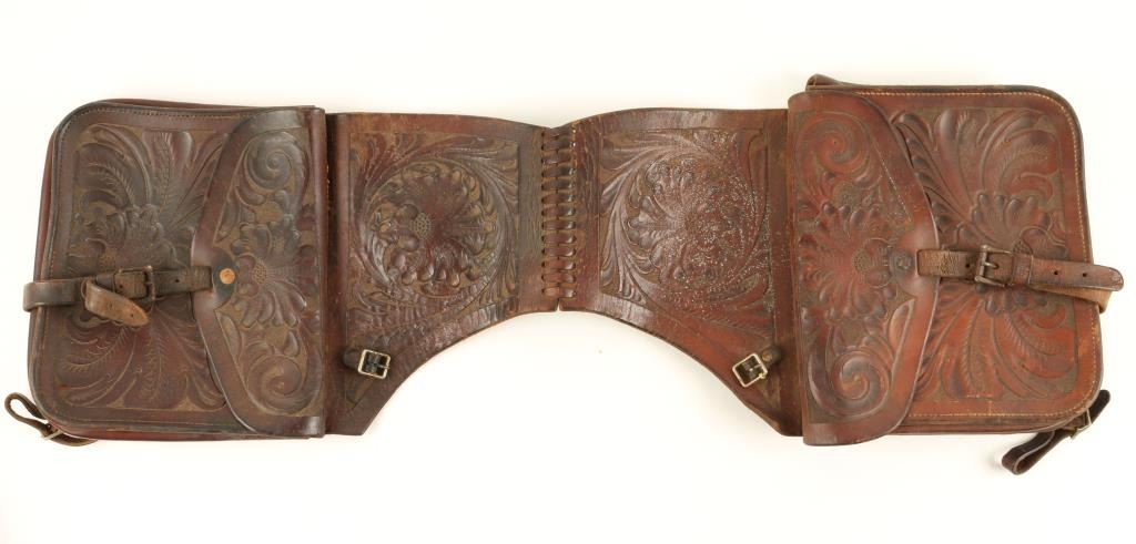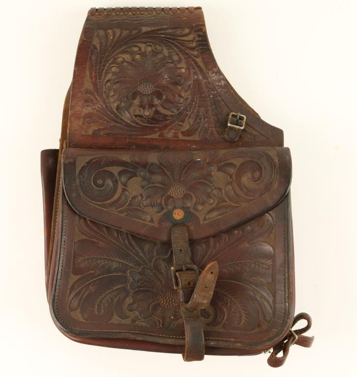 Lot 1329 Unmarked tooled leather saddle bags in very good condition. Circa early 1900s. Est.: $100-$200