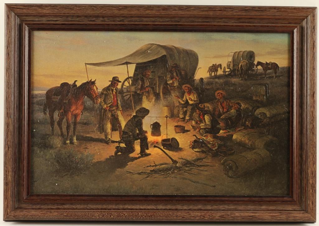 Lot 1330 Framed enhanced color photo of a painting of cowboys around a campfire by the chuck wagon (signatu