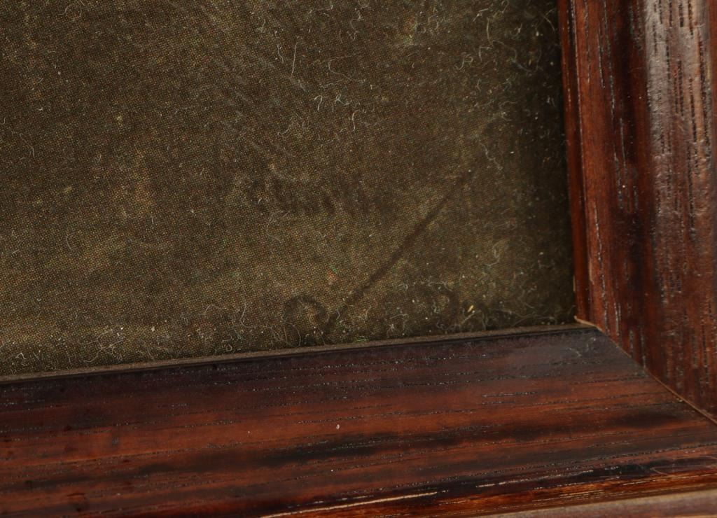 Framed enhanced color photo of a painting of cowboys around a campfire by the chuck wagon (signature appears to be Clarke over a branding iron); approximately 15.5” x 22” overall; a nice decorator for the Western theme or gun room.Est.: $50-$100.