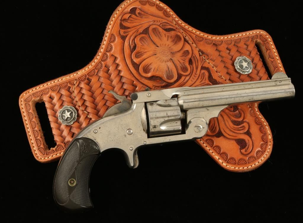 Smith & Wesson Second Model spur trigger revolver, .32 caliber, 3.5” barrel, S/N 35429, nickel finish, checkered black hard rubber grips in overall very good condition showing the majority of its original nickel finish with a very goodbore, crisp action, sharp markings and very good grips. Accompanied by a modern tooled leather holster by John Henke. (Antique). Est.: $250-$500.